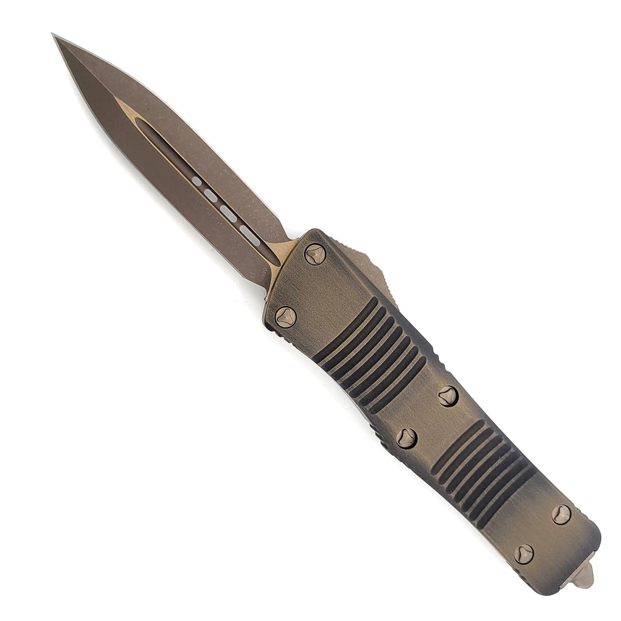 This model features antique bronze aluminum handle. Bronze apocalyptic finished M390 stainless steel double edge dagger blade with standard cutting edges. Apocalyptic Bronze finished hardware, reversible pocket clip, and glass breaker. The blade has the model information. The clip features the Microtech logo, Signatue Series logo, serial number, and production date. Brand new in box.