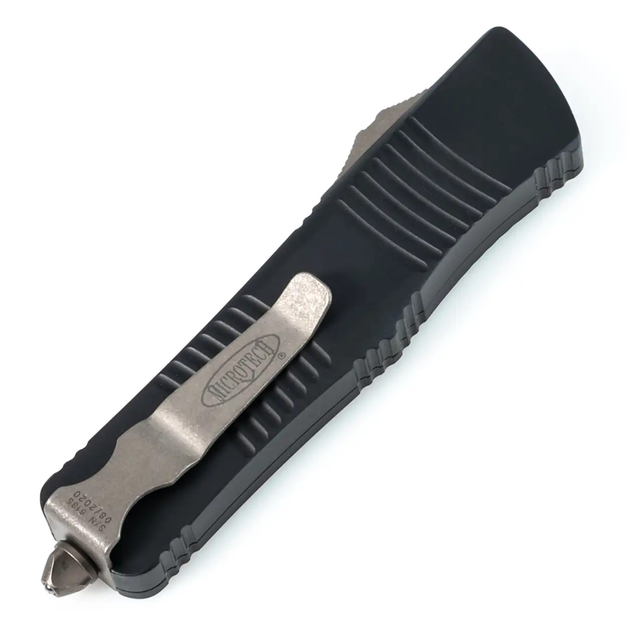 This model features a black handle and a black anodized 6061-T6 aluminum bottom handle scale. Bronze finished M390 stainless steel double edge dagger blade with standard cutting edges. Bronze finished hardware, reversible pocket clip, and glass breaker. The blade has the model information. The clip features the Microtech logo, serial number, and production date. Brand new in box.