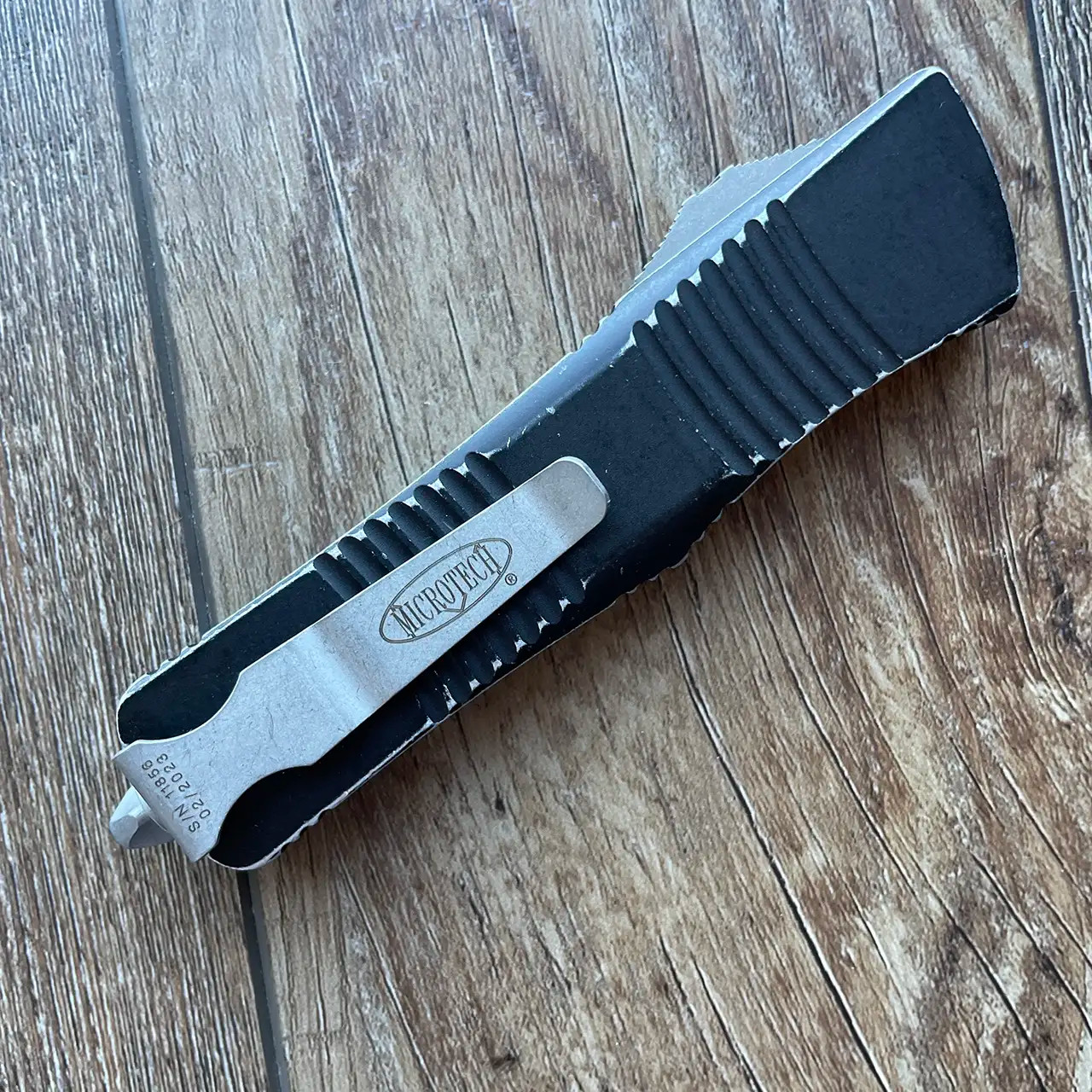 This model features distressed black anodized 6061-T6 aluminum handle scales with the Microtech Claw logo on the front. Apocalyptic finished M390 stainless steel double edge dagger blade with double serrated blade. Apocalyptic finished hardware, reversible pocket clip, lanyard hole, and glass breaker. The blade has the model information. The clip features the Microtech logo, serial number, and production date. Brand new in box.