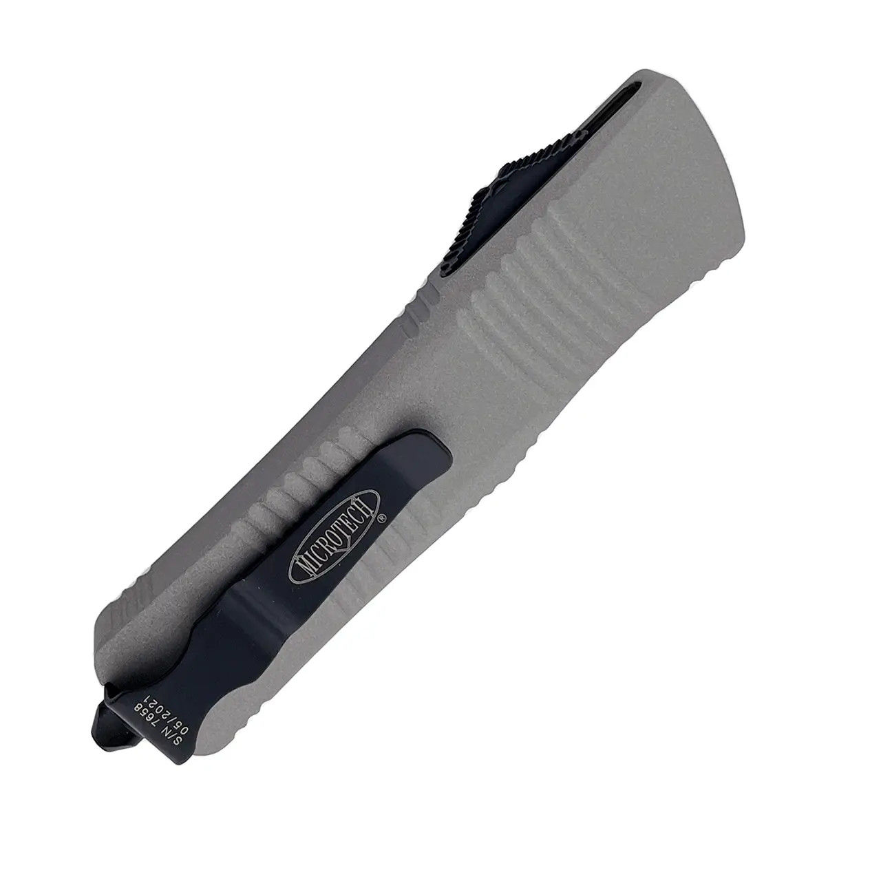 This model features titanium gray anodized 6061-T6 aluminum handle scales with the Microtech Claw logo on the front. Black finished M390 stainless steel double edge blade. Black finished hardware, reversible pocket clip, and glass breaker. The blade has the model information. The clip features the Microtech logo, serial number, and production date. Brand new in box.