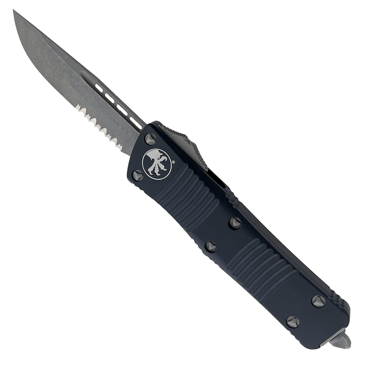This model features black anodized 6061-T6 aluminum handle scales with the Microtech Claw logo on the front. Apocalyptic finished 204P stainless steel drop point blade with partially serrated cutting edge. Apocalyptic finished hardware, reversible pocket clip, and glass breaker. The blade has the model information. The clip features the Microtech logo, serial number and production date. Brand new in box.