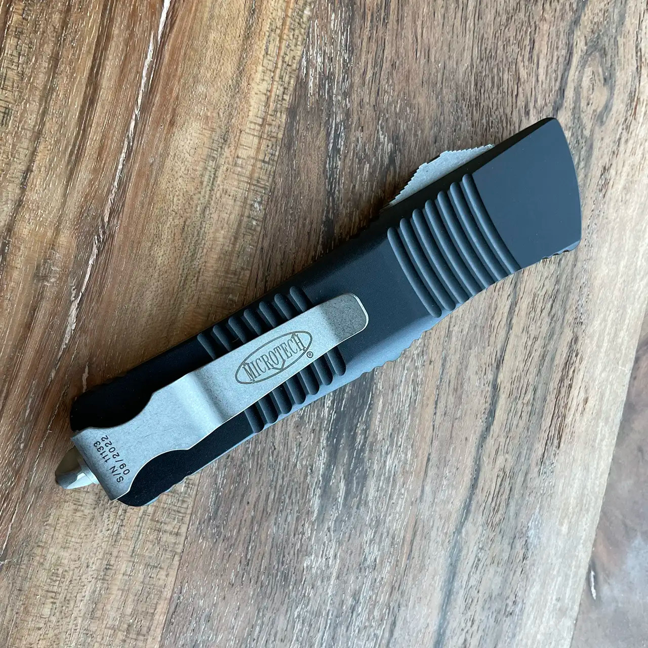 This model features black anodized 6061-T6 aluminum handle scales with the Microtech Claw logo on the front. Apocalyptic finished M390 stainless steel tanto blade with a standard cutting edge. Apocalyptic finished hardware, reversible pocket clip, and glass breaker. The blade has the model information. The clip features the Microtech logo, serial number and production date. Brand new in box.