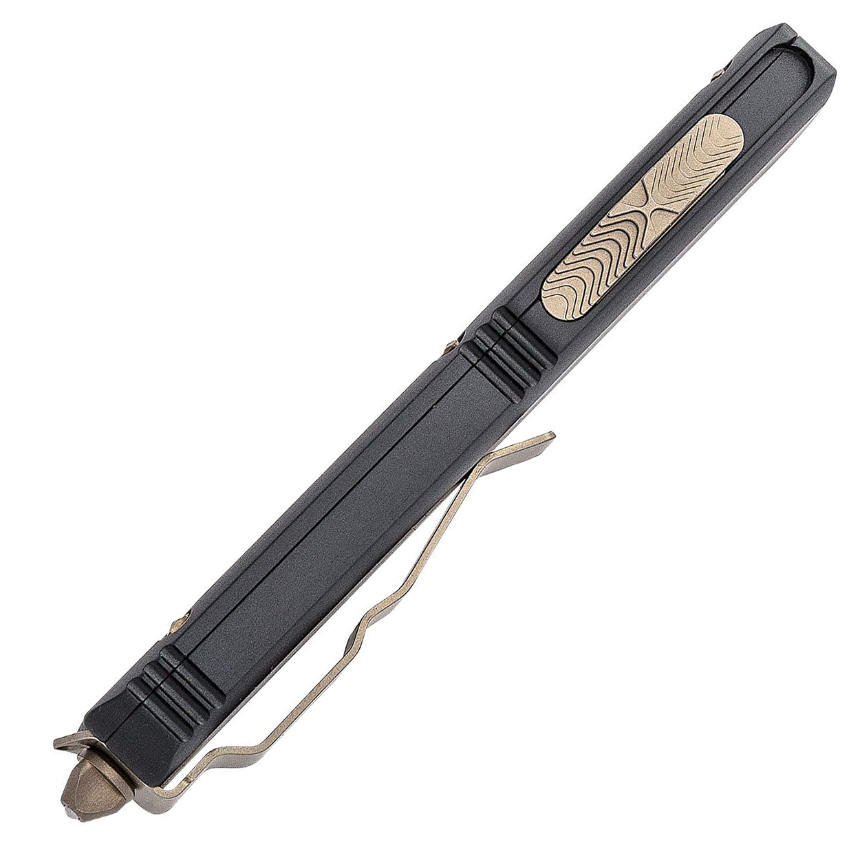 This model has contoured black anodized 6061-T6 aluminum handle scales with the Microtech Claw logo on the front. Bronze finished M390 stainless steel double edge bayonet style blade. Bronze finished hardware. Reversible pocket clip, lanyard hole, and glass breaker. The blade has the model information. The clip features the Microtech logo, serial number, and production date. Brand new in box.