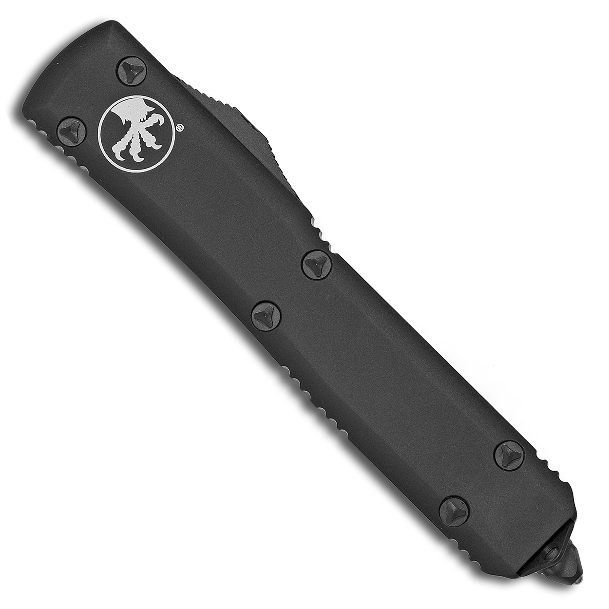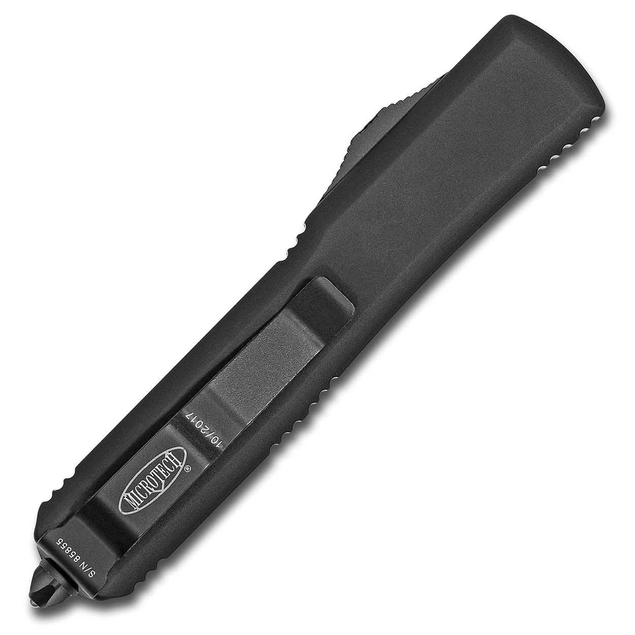 This model has contoured black anodized 6061-T6 aluminum handle scales with the Microtech Claw logo on the front. Two tone black finished M390 stainless steel double edge bayonet style blade. Black tactical finished hardware, reversible pocket clip, lanyard hole, and glass breaker. The blade has the model information. The clip features the Microtech logo, serial number, and production date. Brand new in box.
