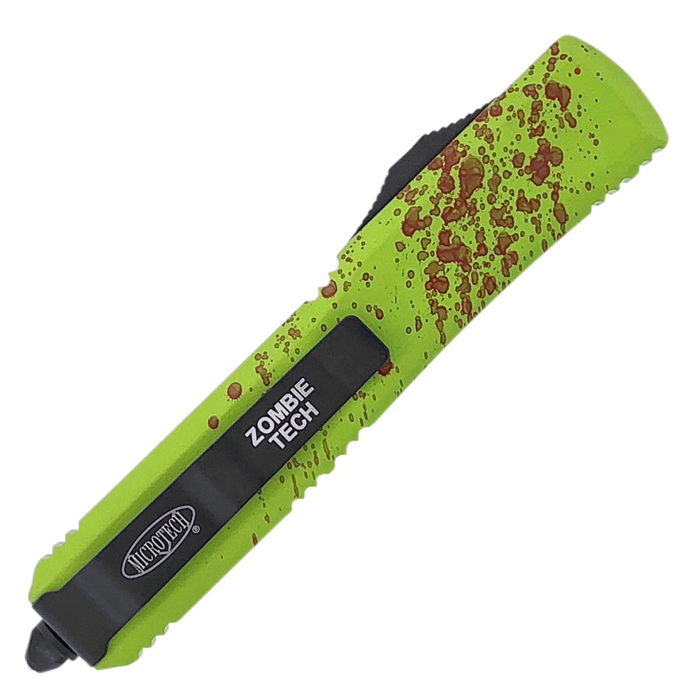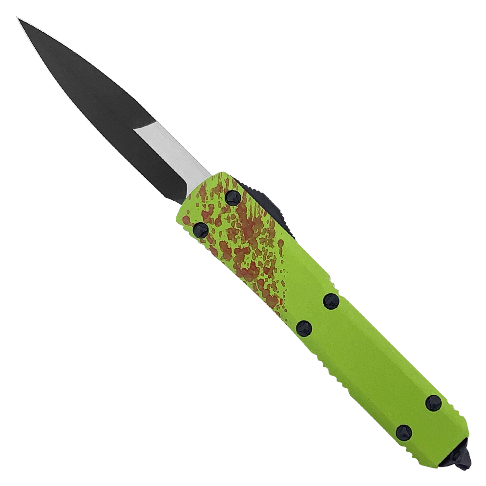 This model features zombie green anodized 6061-T6 contoured aluminum handle scales with unique random blood splatter. Two tone black/satin finished ELMAX stainless steel bayonet style double edge blade. All black tactical finished hardware. Reversible pocket clip, lanyard hole, and glass breaker. These Zombie models are sterile with no markings other than the Microtech logo and ZOMBIE TECH on the pocket clip. Brand new in box.