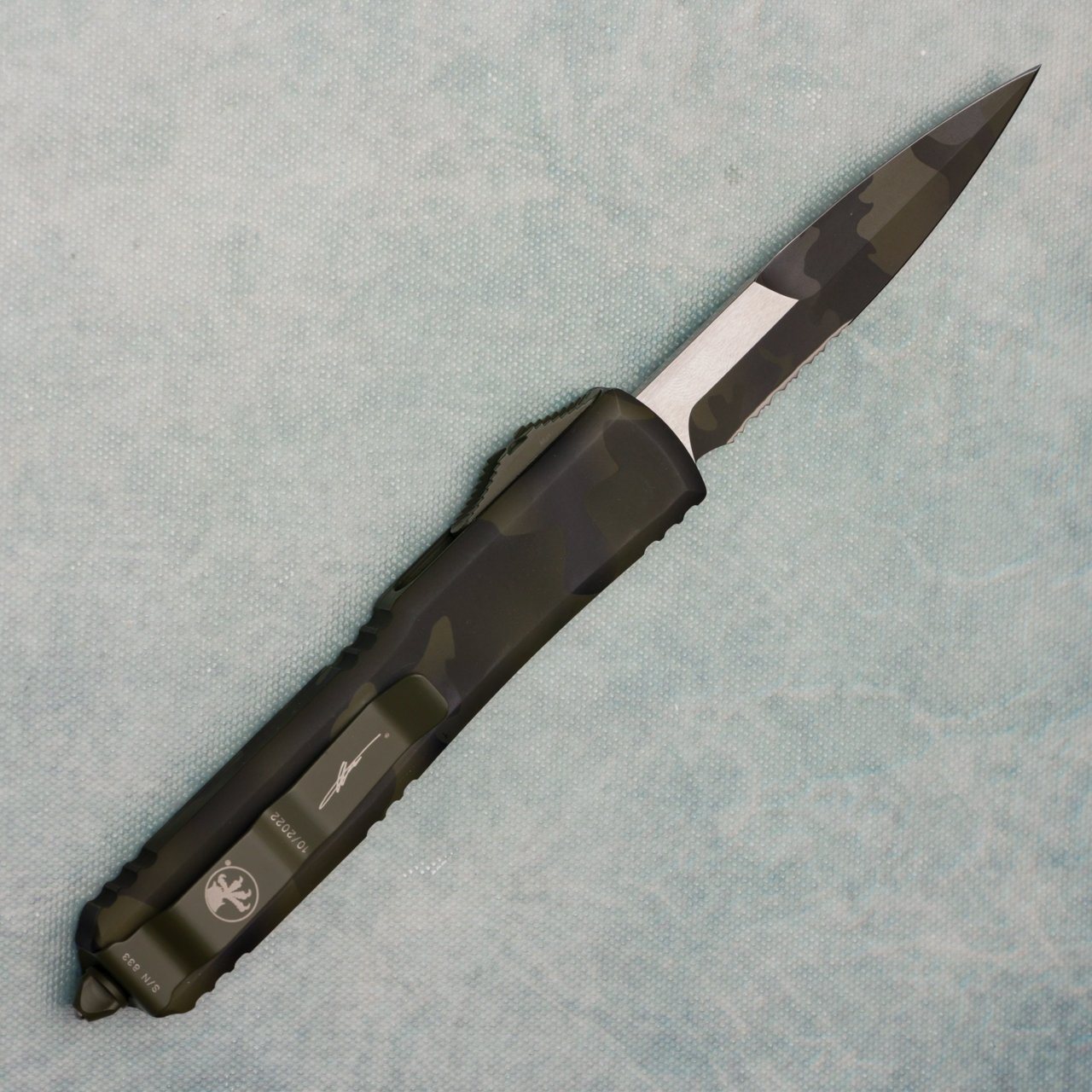 This model features olive camo cerakote 6061-T6 contoured aluminum handle scales. Matching finished M390 stainless steel bayonet style double edge blade featuring one standard cutting edge and one partial serrated cutting edge. Cerakote finished hardware, reversible pocket clip, lanyard hole, and glass breaker. The clip features the Microtech logo, production date, and serial number. The blade has the Microtech logo and model information. Has a very very small mark or two otherwise great shape in box.