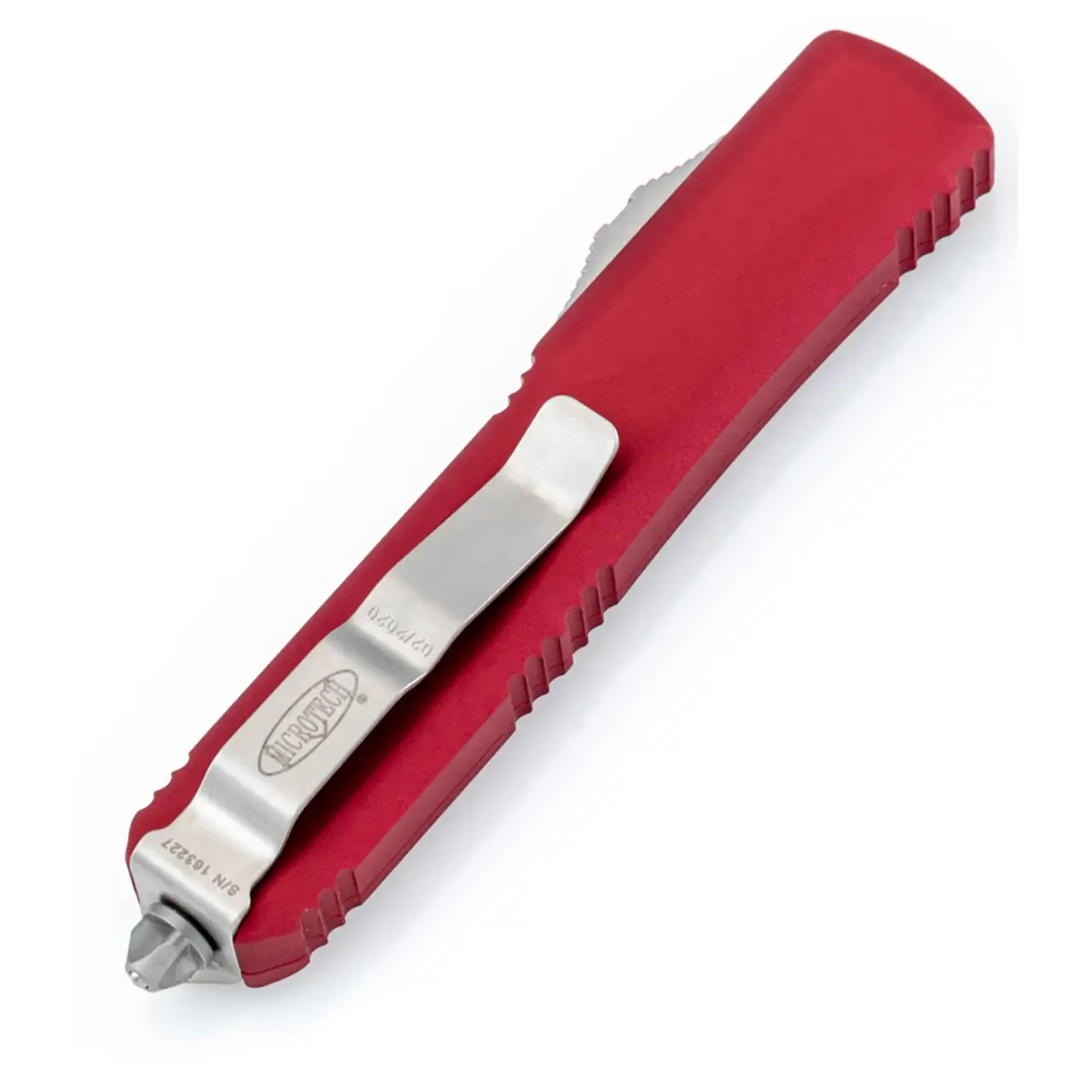 This model features red anodized 6061-T6 contoured aluminum handle scales with the Microtech Claw logo on the front. Stonewash finished M390 stainless steel bayonet style double edge blade. Bead blasted hardware. Reversible pocket clip, lanyard hole, and glass breaker. The clip features the Microtech logo, serial number, and production date. Brand new in box.