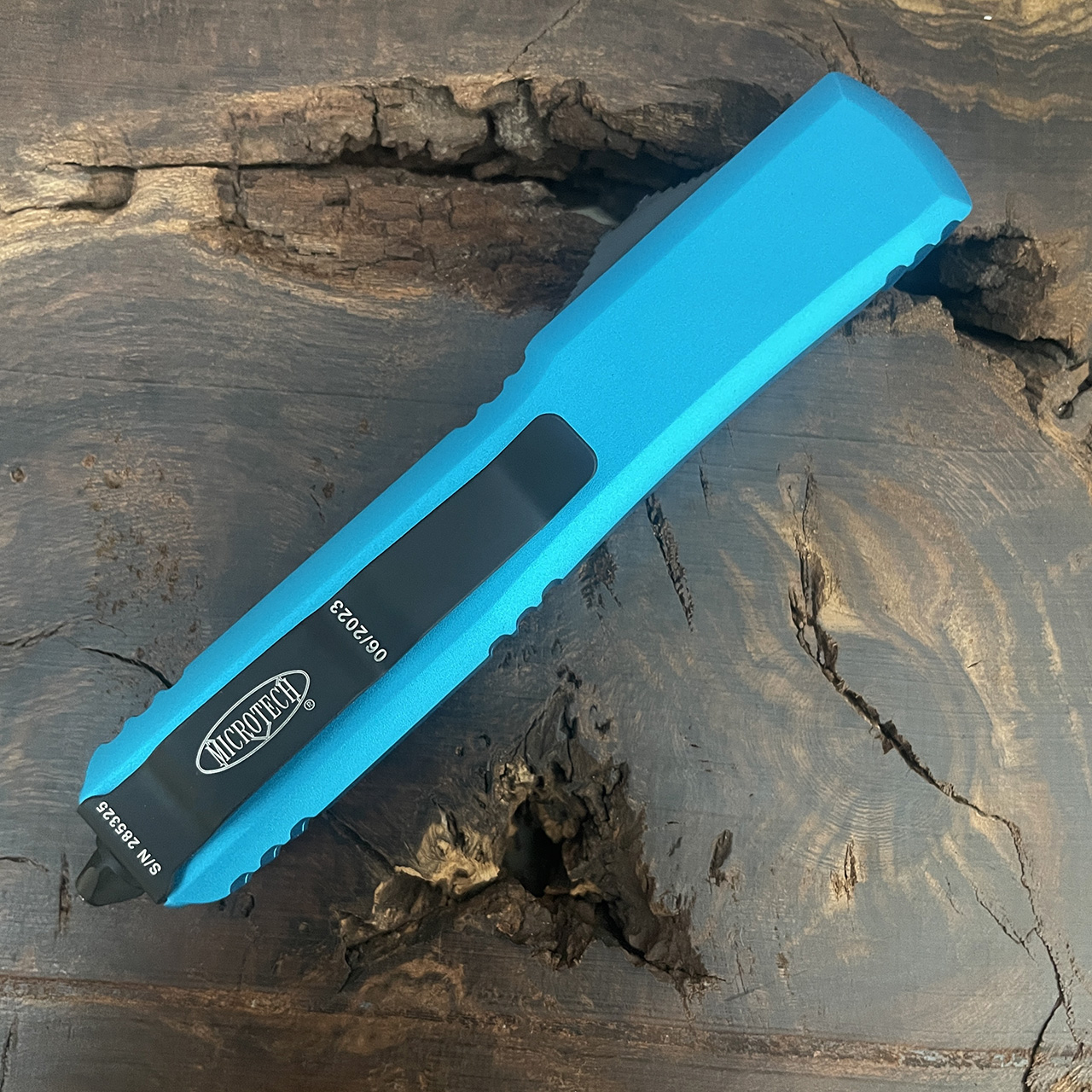 This model features turquoise anodized 6061-T6 contoured aluminum handle scales with the Microtech Claw logo on the front. Two tone black/satin finished M390 stainless steel bayonet style double edge blade. Black finished hardware, reversible pocket clip, lanyard hole, and glass breaker. The clip features the Microtech logo, production date, and serial number. The blade has the Microtech logo and model information. Brand new in box.
