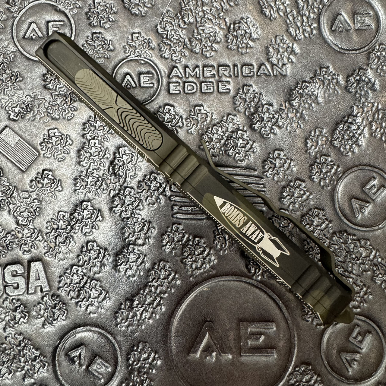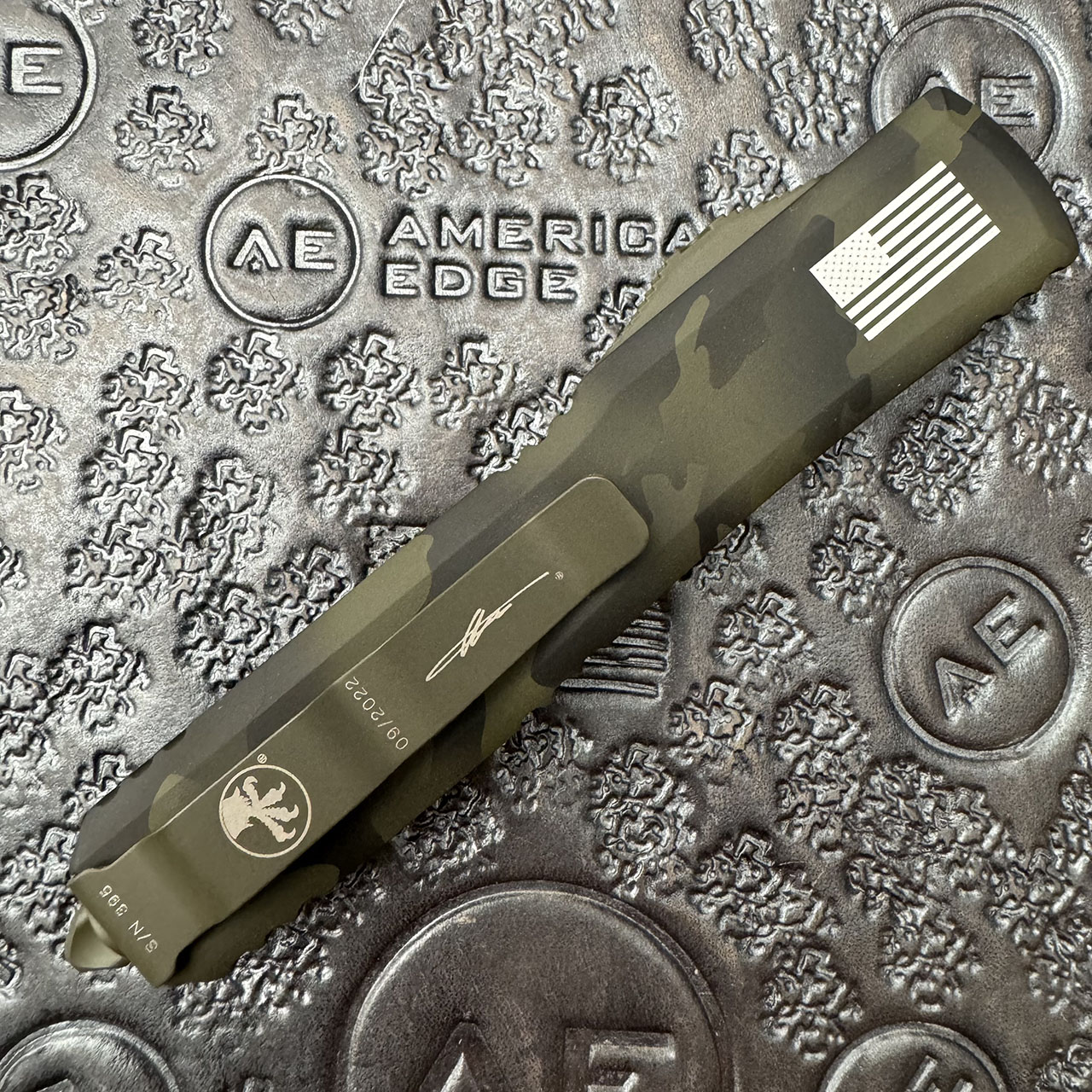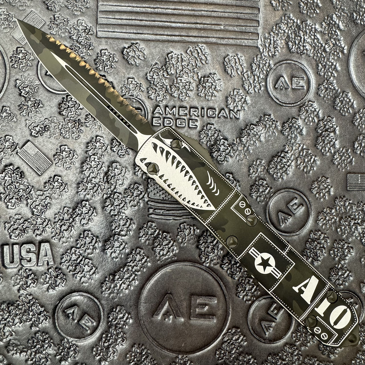 Microtech Ultratech D/E A-10 Engraved Olive Camo Cerakote Handle Olive Camo Cerakote Full Serrated Blade Signature Series AE Custom Shop 122-3OCSA10
