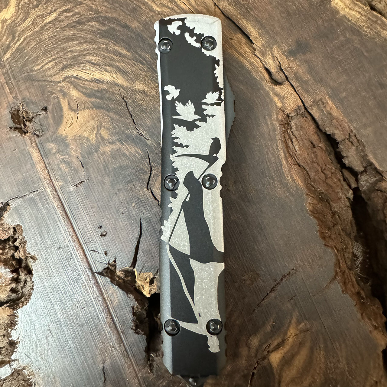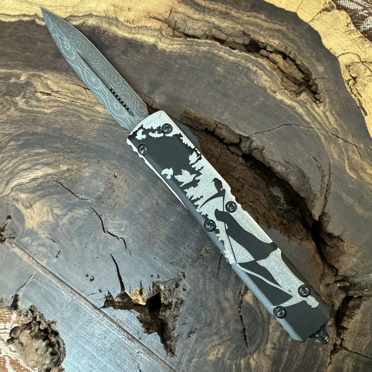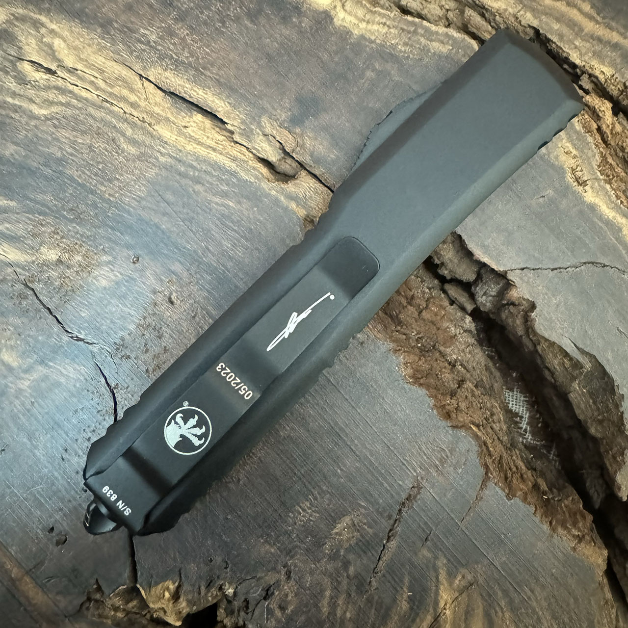 This signature series model has contoured black anodized 6061-T6 aluminum handle scale AE Custom Shop engraved with reaper scene. Damascus double edge dagger blade with standard cutting edges. Black ringed hardware, reversible pocket clip, layard hole, and glass breaker. The clip features the Microtech claw logo, Signature Series logo, production date and serial number. This knife does not disappoint! Brand new in box.