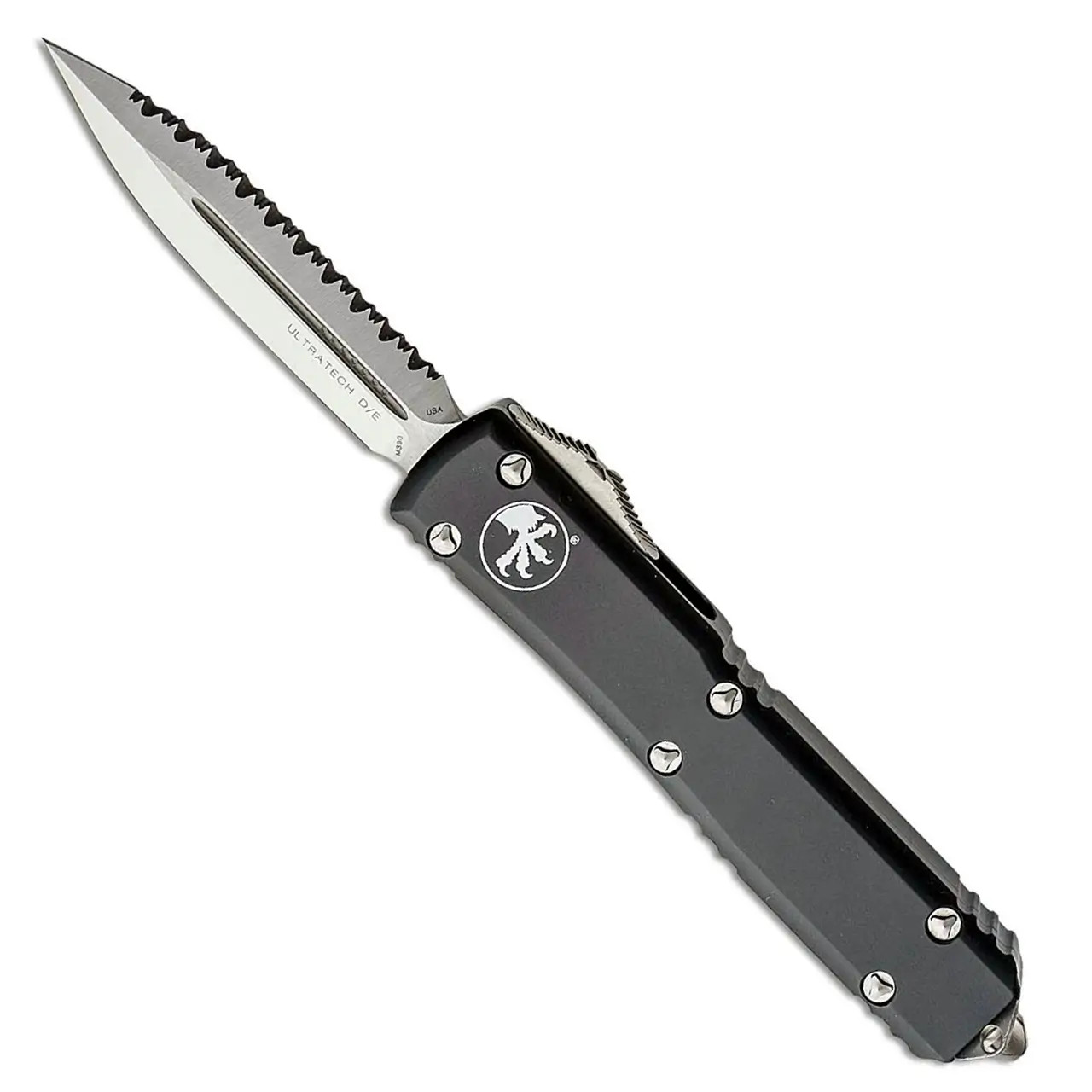 This model has black anodized 6061-T6 aluminum handle scales with the Microtech Claw logo on the front. Satin finished M390 stainless steel double edge dagger blade with one standard cutting edge and one full serrated cutting edge. Bead blast finished hardware, reversible pocket clip, and glass breaker. The blade has the model information. The clip features the Microtech logo, serial number and production date. Brand new in box.