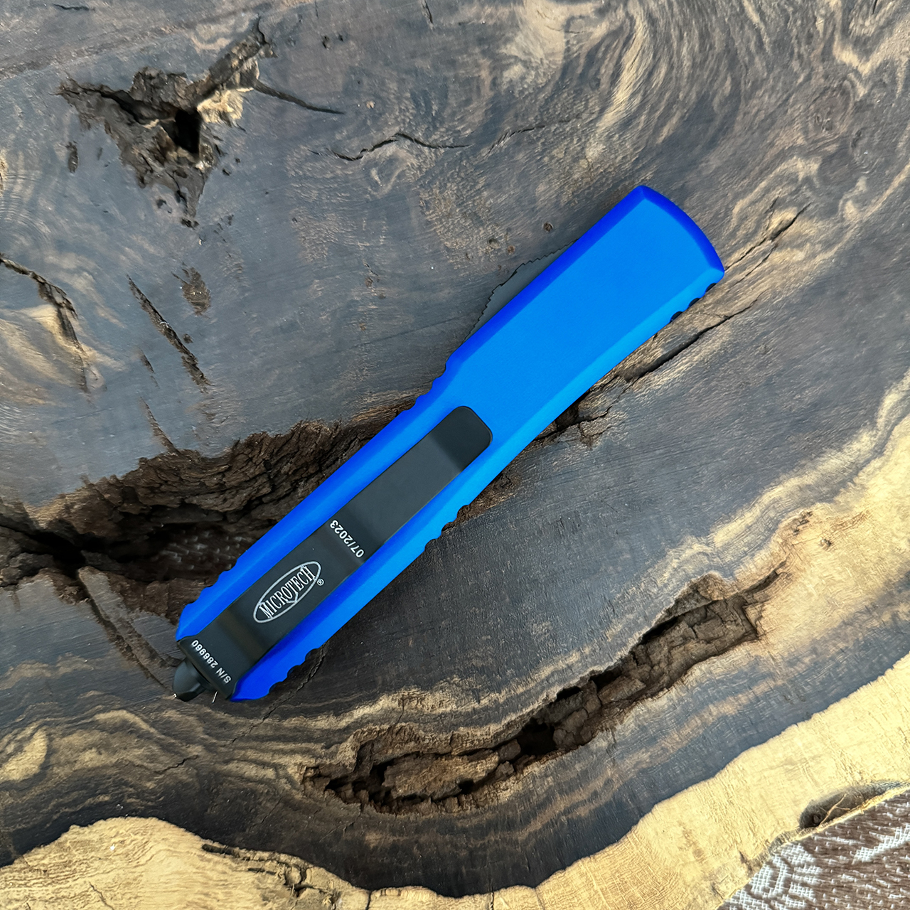 This model has blue anodized 6061-T6 aluminum handle scales with the Microtech Claw logo on the front. Two tone black finished M390 stainless steel double edge blade with one standard and one fully serrated cutting edge. All black tactical finished hardware. Reversible pocket clip, lanyard hole, and glass breaker. The blade has the model information. The clip features the Microtech logo, serial number and production date. Brand new in box.