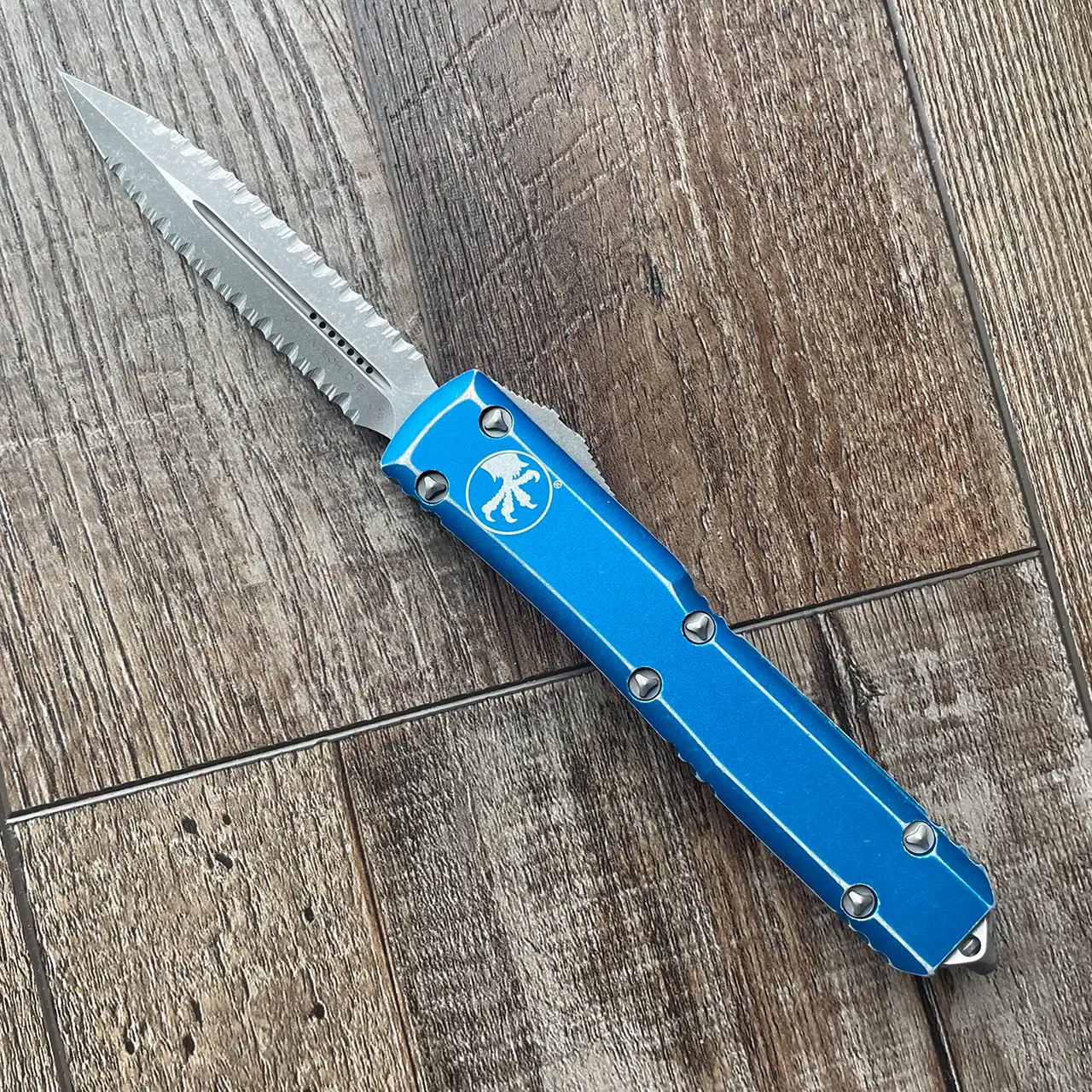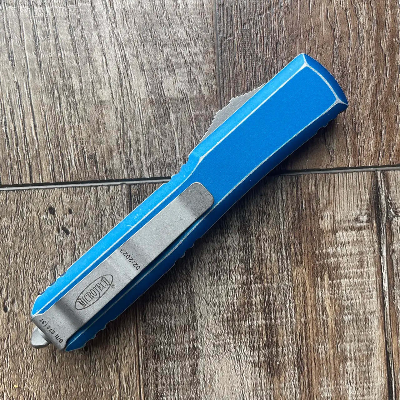 Microtech Ultratech D/E Distressed Blue Apocalyptic Double Full Serrated 122-D12DBL