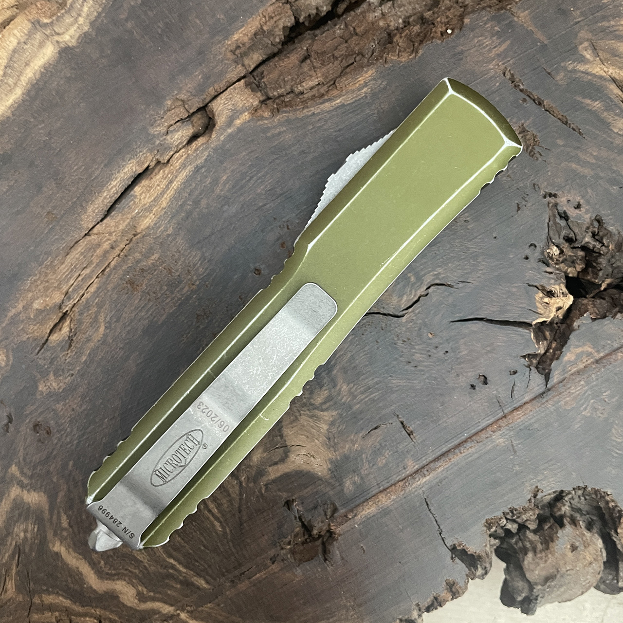 Microtech Ultratech D/E Distressed OD Green Apocalyptic Double Full Serrated 122-D12DOD