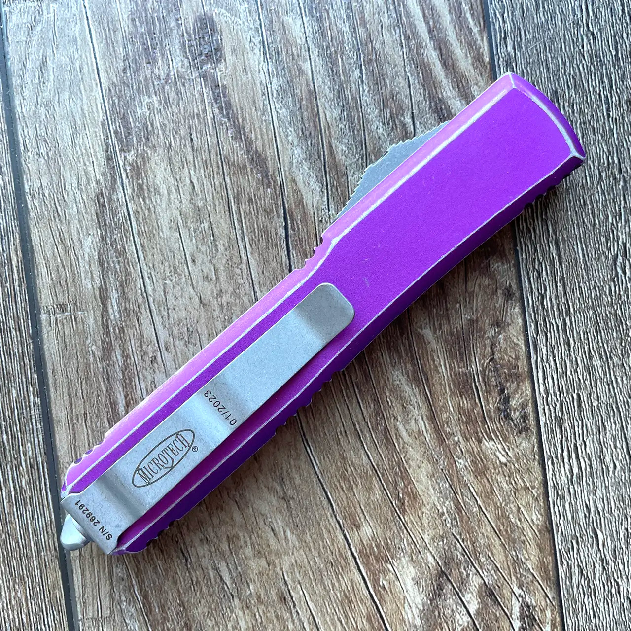 This model has distressed violet anodized aluminum handle scales with the claw logo on the front. Apocalyptic finished M390 stainless steel double edge dagger blade with double serrated cutting edges. Apocalyptic finished hardware, reversible pocket clip, lanyard hole, and glass breaker. The blade has the model information. The clip features the Microtech logo, serial number and production date. Brand new in box.