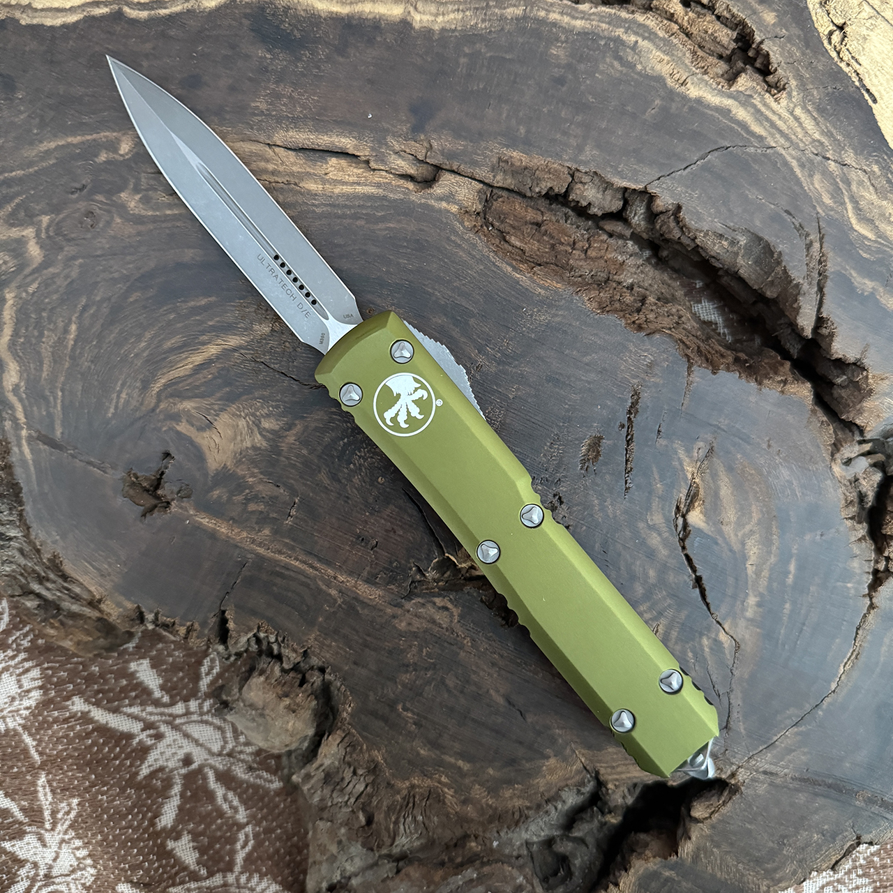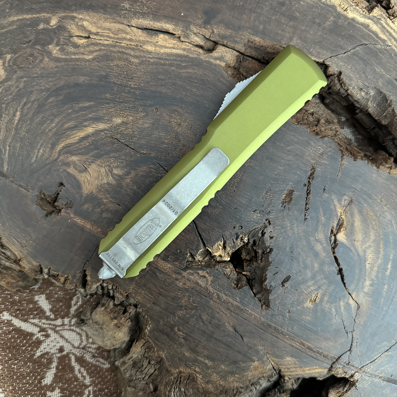 This model has OD Green anodized 6061-T6 aluminum handle scales with the Microtech Claw logo on the front. Apocalyptic finished M390 stainless steel double edge blade with standard cutting edges. Apocalyptic finished hardware. Reversible pocket clip, lanyard hole, and glass breaker. The blade has the model information. The clip features the Microtech logo, serial number and production date. Brand new in box.