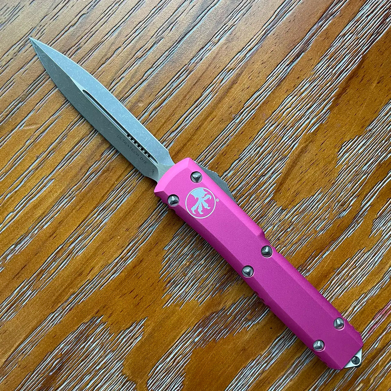 This model has pink anodized 6061-T6 aluminum handle scales with the claw logo on the front. Bronzed Apocalyptic finished M390 stainless steel double edge dagger blade with standard cutting edges. Bronzed finished hardware, reversible pocket clip, lanyard hole, and glass breaker. The blade has the model information. The clip features the Microtech logo, serial number and production date. Brand new in box.