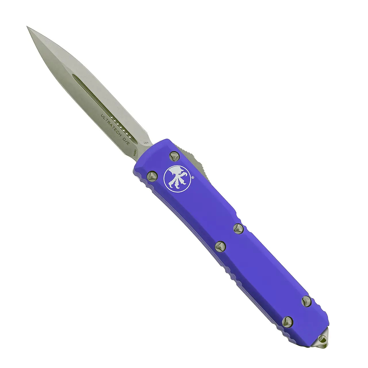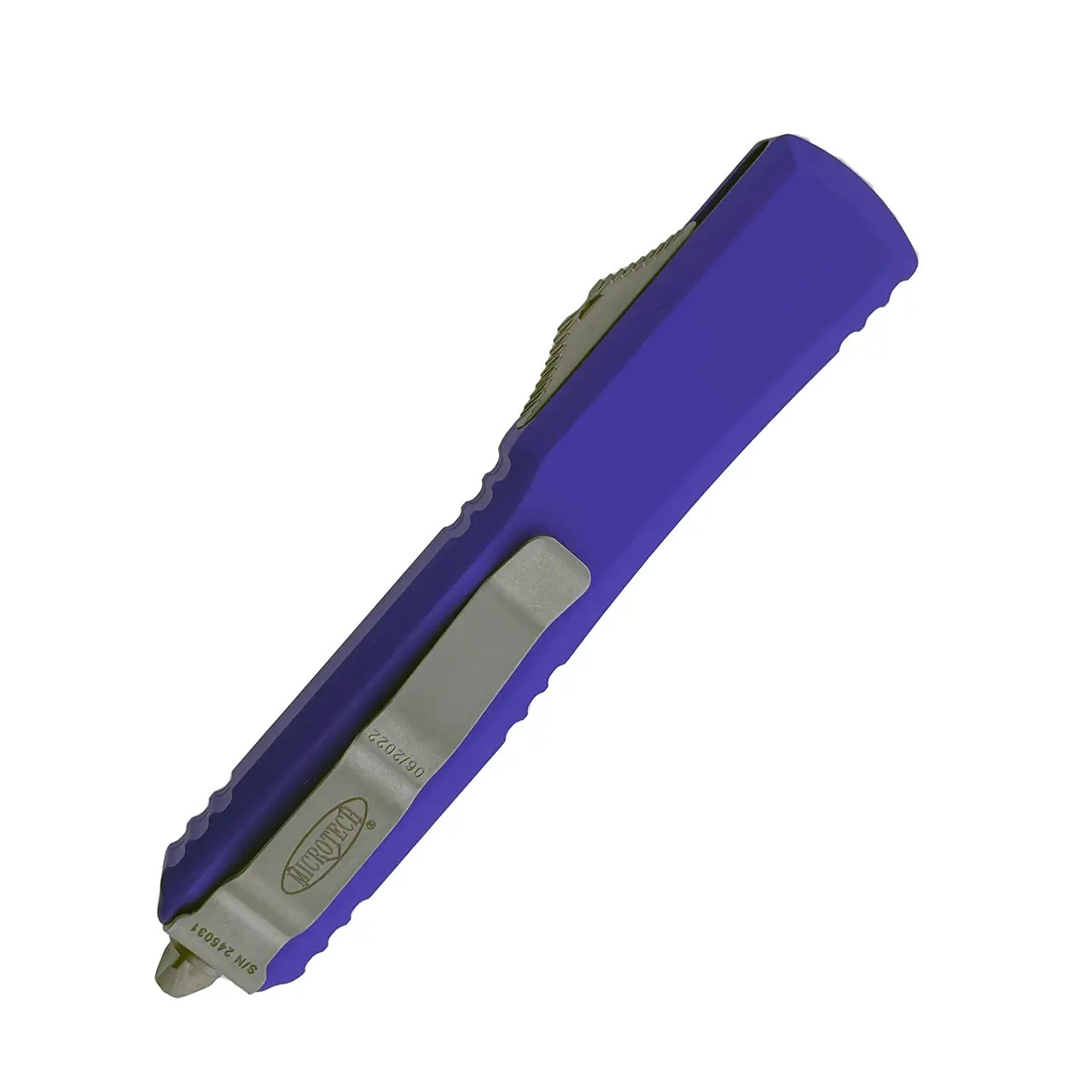 This model has contoured purple anodized 6061-T6 aluminum handle scales with the Microtech Claw logo on the front. Stonewash finished M390 stainless steel double edge blade with standard cutting edges. Bead blast finished hardware. Reversible pocket clip, lanyard hole, and glass breaker. The blade has the model information. The clip features the Microtech logo, serial number and production date. Brand new in box.