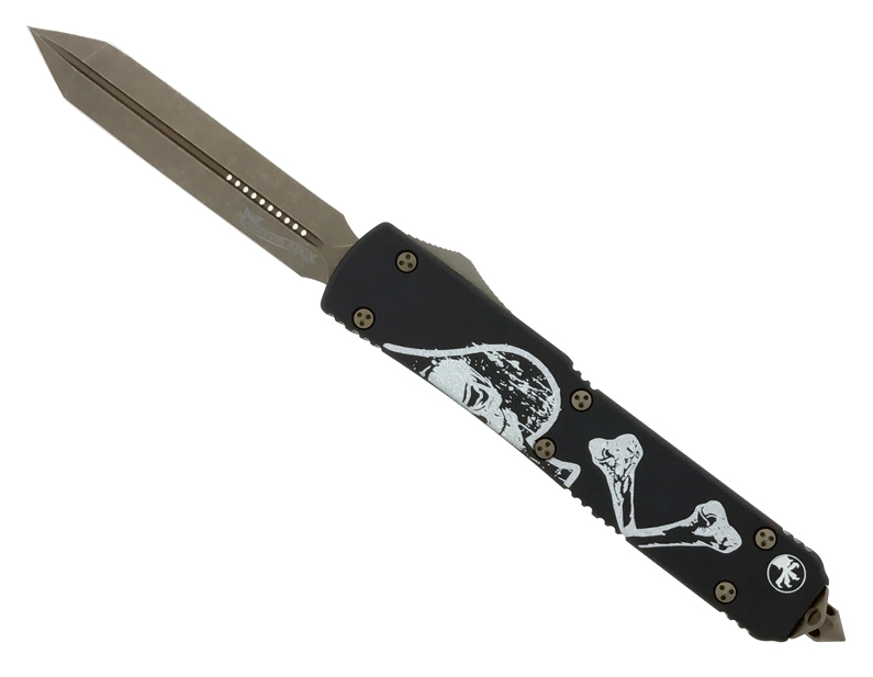 This limited edition Spartan Death Card model has a double tanto edge spartan bronze apocalyptic finished ELMAX stainless steel blade with standard cutting edges. Black anodized 6061-T6 aluminum handle featuring a spade with skull and cross bones as well as the Microtech claw logo. Bronze finished hardware and glass breaker tip. The pocket clip is bronze apocalyptic finished and marked with the serial number, date of manufacture and Microtech Claw logo. These awesome limited edition Ultratech's from Microtech can be matched to complete the graphic on the handle, there are four knives total in the series that can make two matched sets. Don't miss you chance to own these ones they will not last long! Brand new in box.