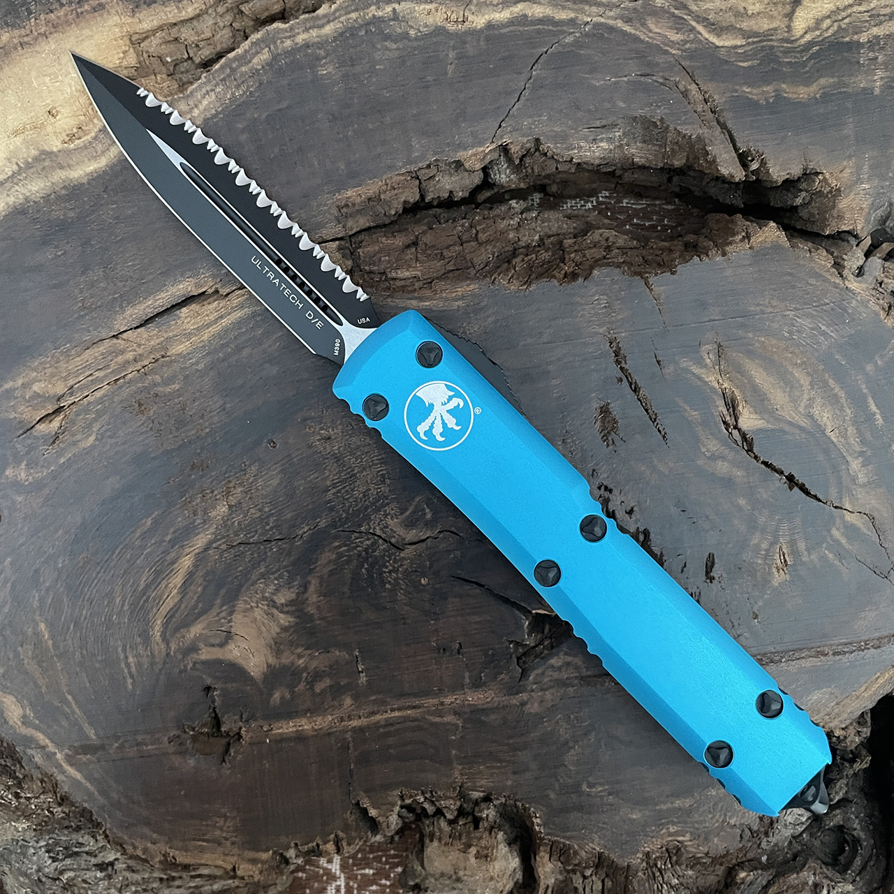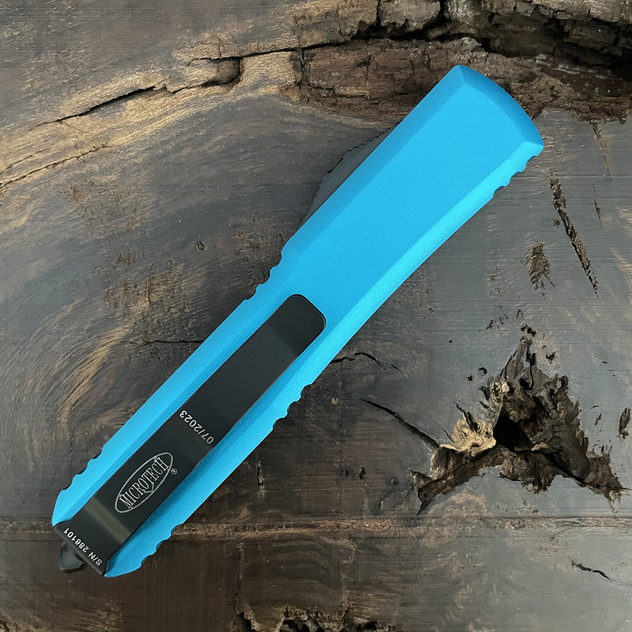 This model has turquoise anodized 6061-T6 aluminum handle scales with the Microtech Claw logo on the front. Two tone black finished M390 stainless steel double edge blade with one standard and one fully serrated cutting edge. All black tactical finished hardware. Reversible pocket clip, lanyard hole, and glass breaker. The blade has the model information. The clip features the Microtech logo, serial number and production date. Brand new in box.