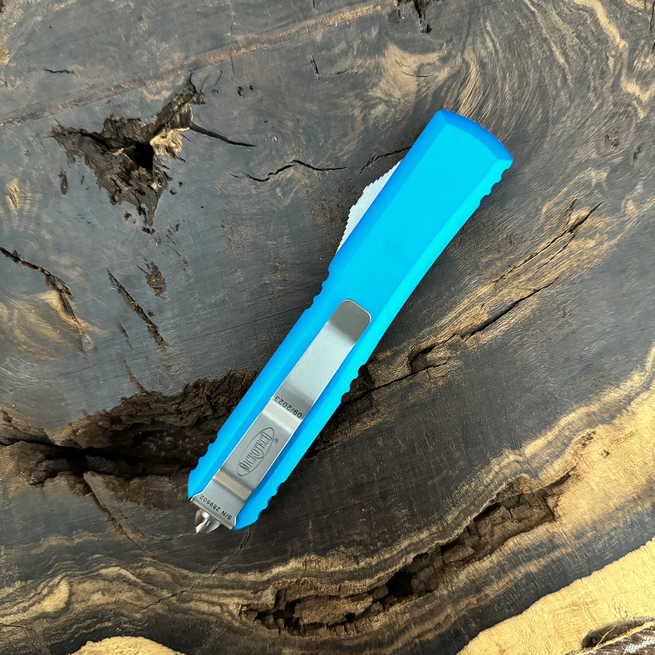This model has turquoise anodized 6061-T6 aluminum handle scales with the Microtech Claw logo on the front. Stonewash finished M390 stainless steel double edge dagger blade with standard cutting edges. Bead blast finished hardware. Reversible pocket clip, lanyard hole, and glass breaker. The blade has the model information. The clip features the Microtech logo, serial number and production date. Brand new in box.