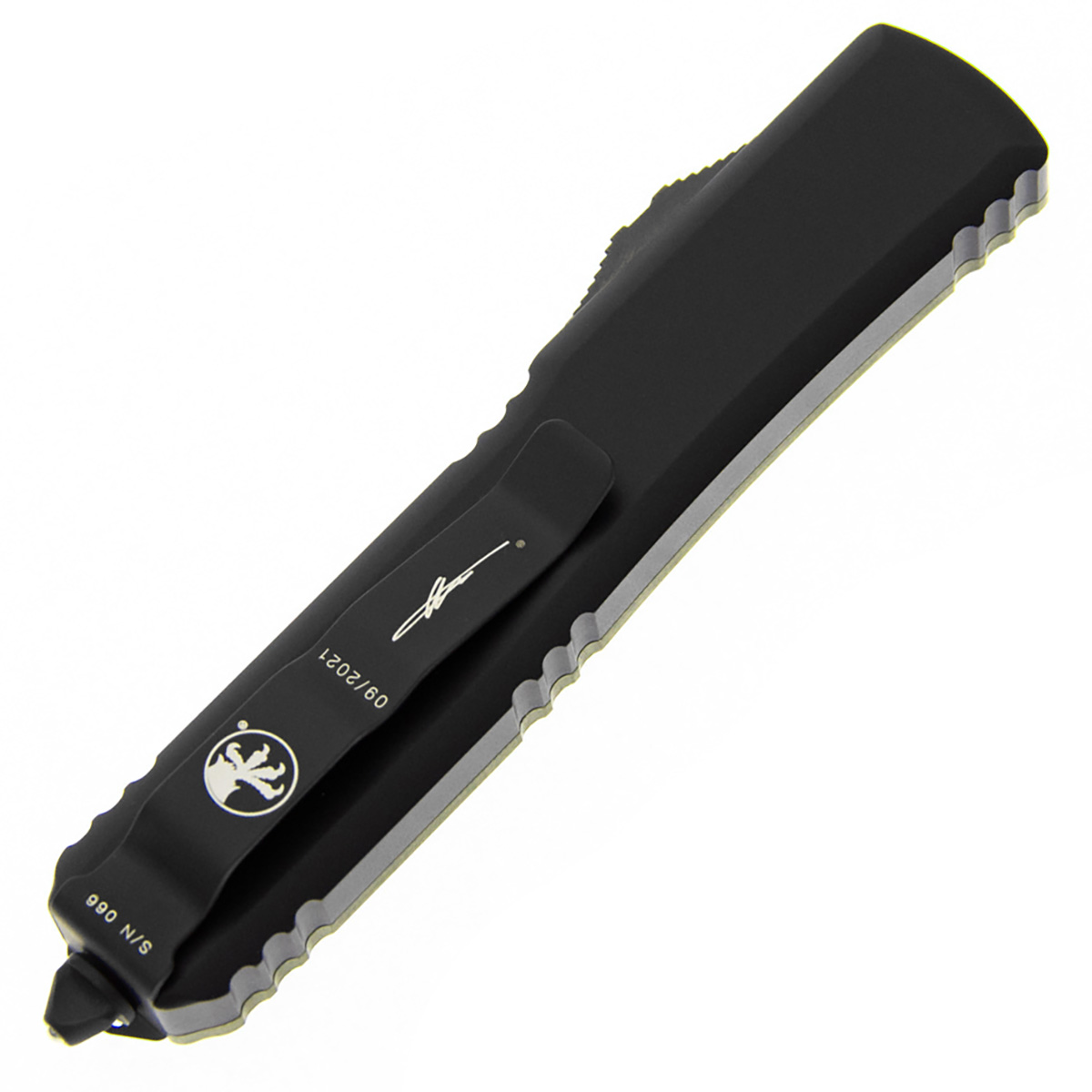 This model features a OD Green G-10 composite top scale and a black anodized 6061-T6 contoured aluminum bottom handle scale. Black finished M390 stainless steel double edge dagger blade. Black finished hardware, reversible pocket clip, lanyard hole, and glass breaker. The clip features the Microtech Claw logo, signature series logo, serial number, and production date. The blade has the Microtech logo and model information. Serial number #095. Limited edition from USN GXII 2021. Brand new in box.