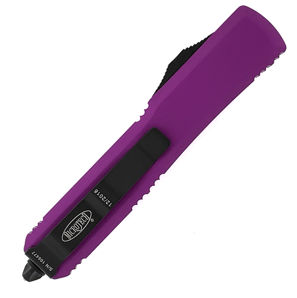 This model has violet anodized 6061-T6 aluminum handle scales with the Microtech Claw logo on the front. Black finished M390 stainless steel double edge blade with standard cutting edges. All black tactical finished hardware. Reversible pocket clip, lanyard hole, and glass breaker. The blade has the model information. The clip features the Microtech logo, serial number and production date. Brand new in box.