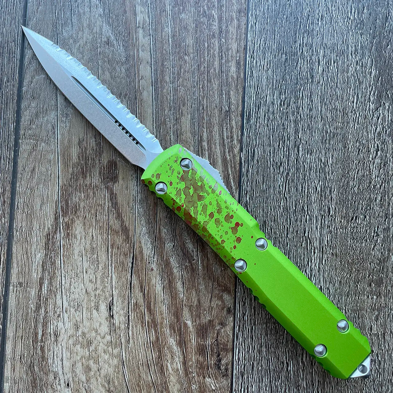 This model features zombie green anodized 6061-T6 contoured aluminum handle scales with random red "blood" spatter. Stonewash finished M390 stainless steel double edge full serrated blade. Beadblast finished hardware, reversible pocket clip, lanyard hole, and glass breaker. The Zombie models are sterile with no markings other than the Microtech logo and Zombie Tech on the pocket clip. Brand new in box.