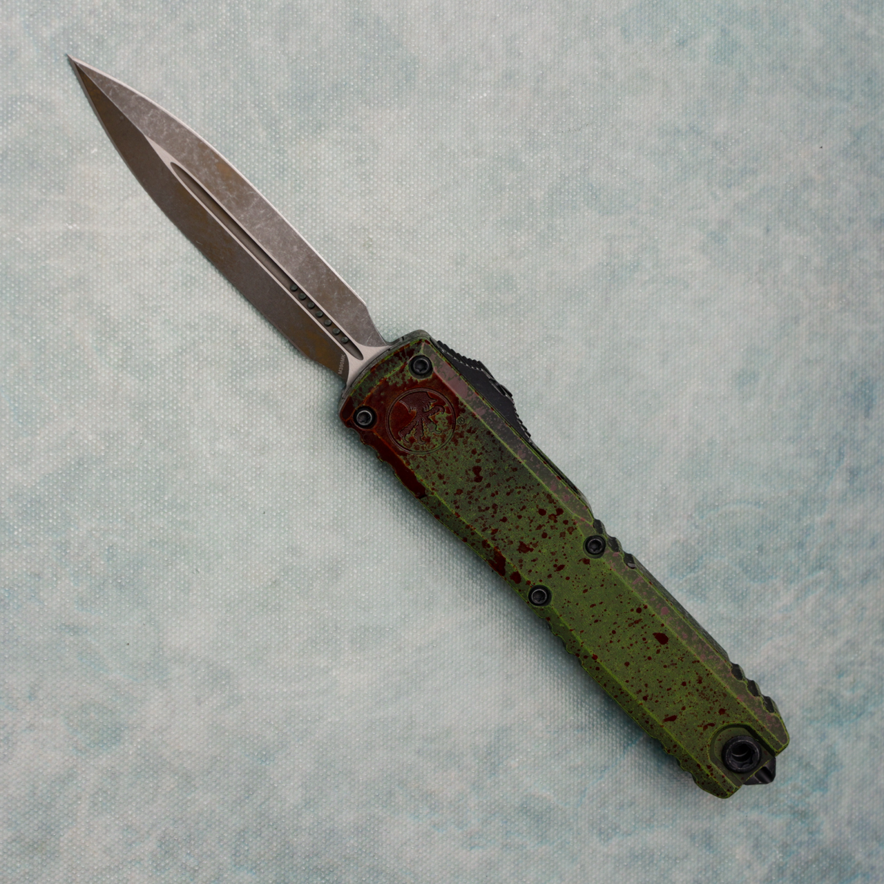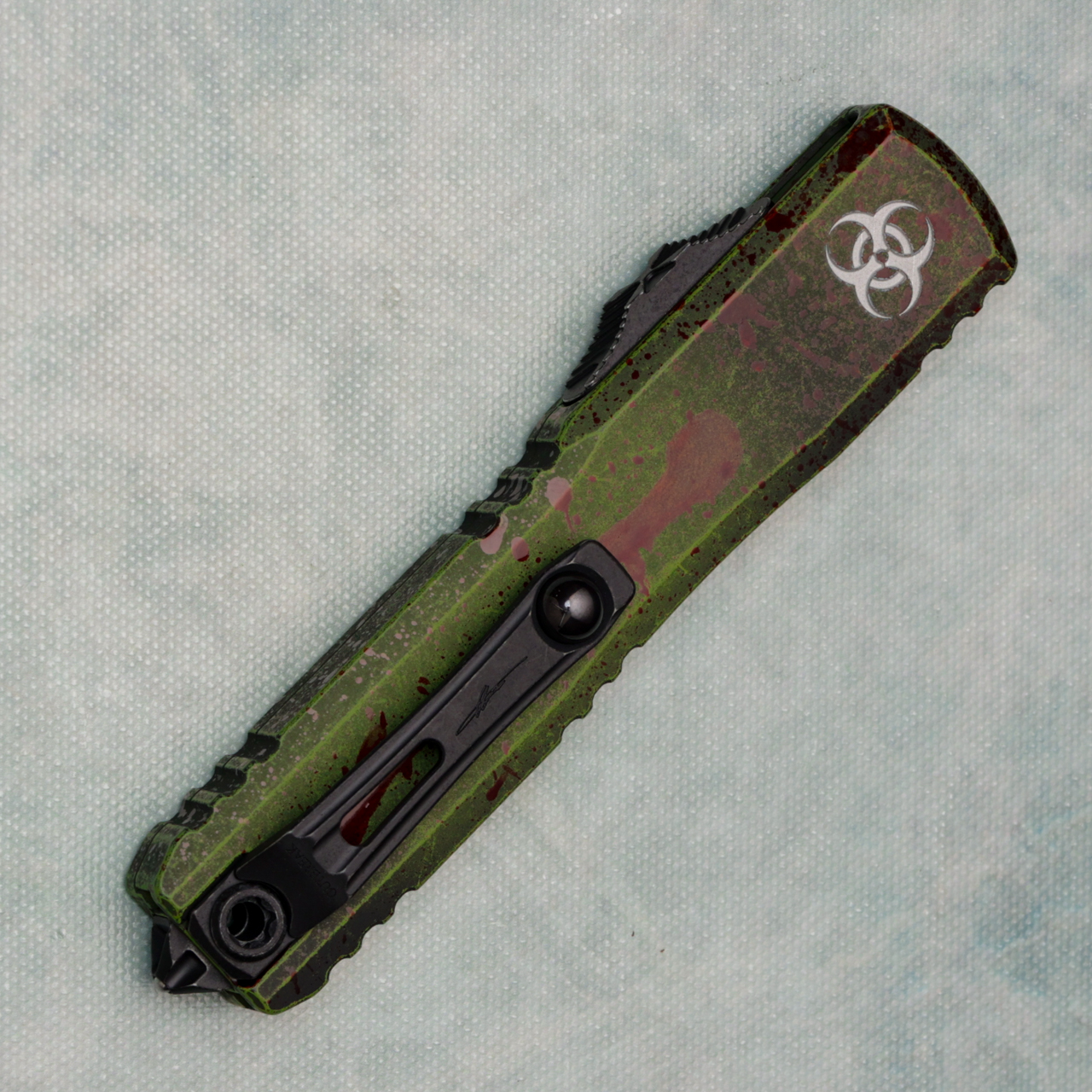 This brand new zero blade tolerance ZBP model runs on the new drive train and has the crud cutter. It has contoured outbreak 6061-T6 aluminum handle scales with the Microtech Claw logo on the front. Outbreak finished M390MK stainless steel double edge blade with standard cutting edges. Black finished hardware. New reversible pocket clip, lanyard hole, and glass breaker. The blade has the model information. Brand new in box.