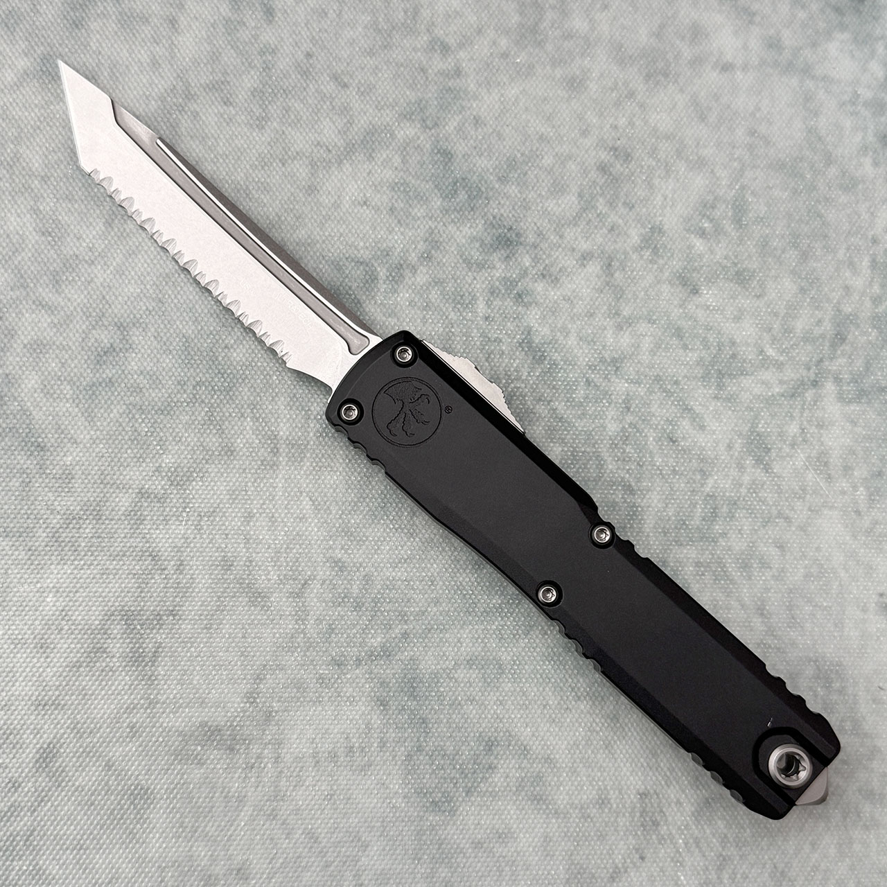 This brand new zero blade play ZBP model runs on the new drive train and has the crud cutter. It has contoured black anodized 6061-T6 aluminum handle scales with the Microtech Claw logo on the front. Stonewash finished M390MK stainless steel tanto edge blade with serrated cutting edge. Bead blast finished hardware. New reversible pocket clip, lanyard hole, and glass breaker. The blade has the model information. Brand new in box.