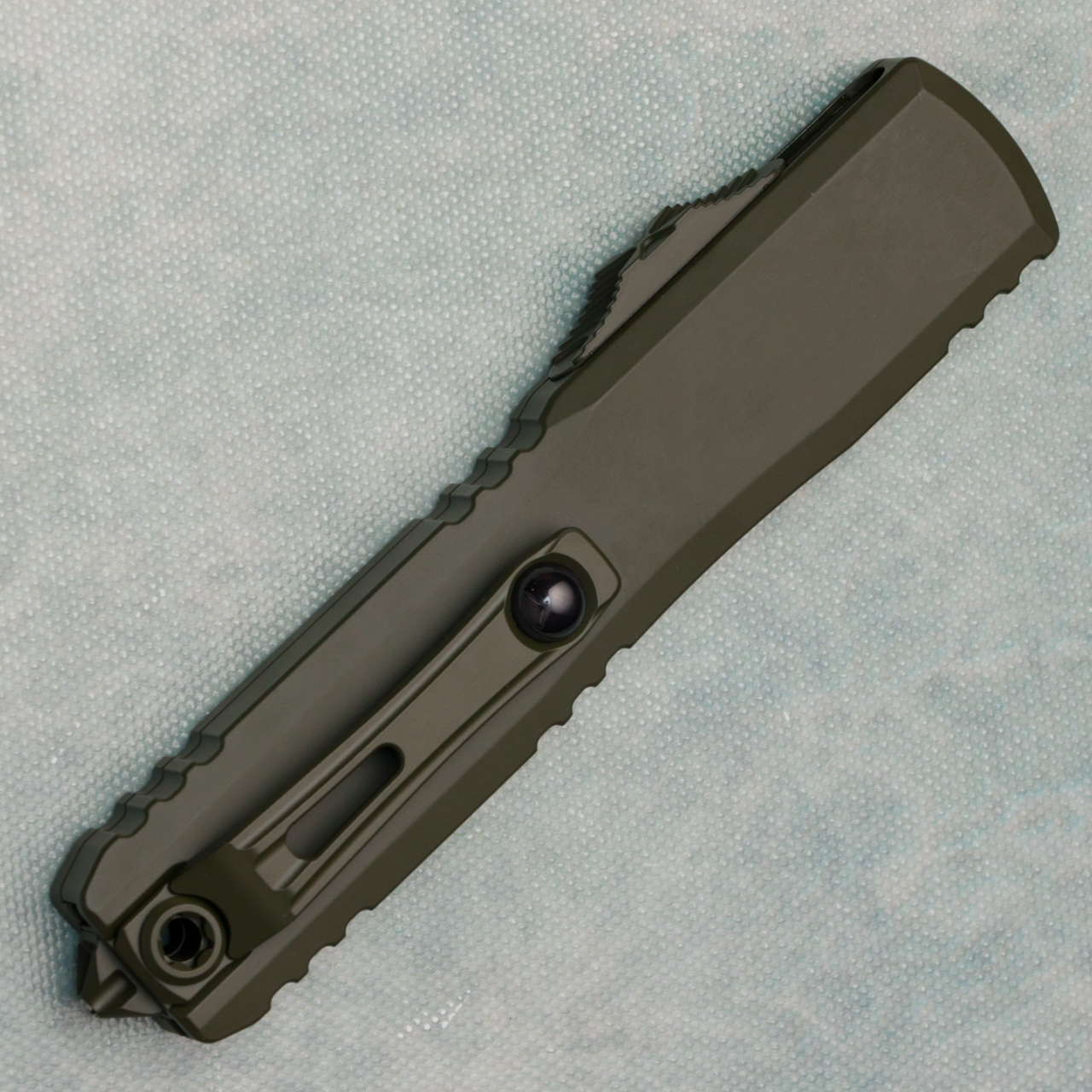 This brand new gen iv model runs on the new drive train and has the crud cutter. It has contoured cerakote od green 6061-T6 aluminum handle scales with the Microtech Claw logo on the front. Cerakote od green finished M390MK stainless steel double edge blade with a double full serrated cutting edge. Cerakote od green finished hardware. New reversible pocket clip, lanyard hole, and glass breaker. The blade has the model information. These are not the zero blade play Ultratechs. Brand new in box.