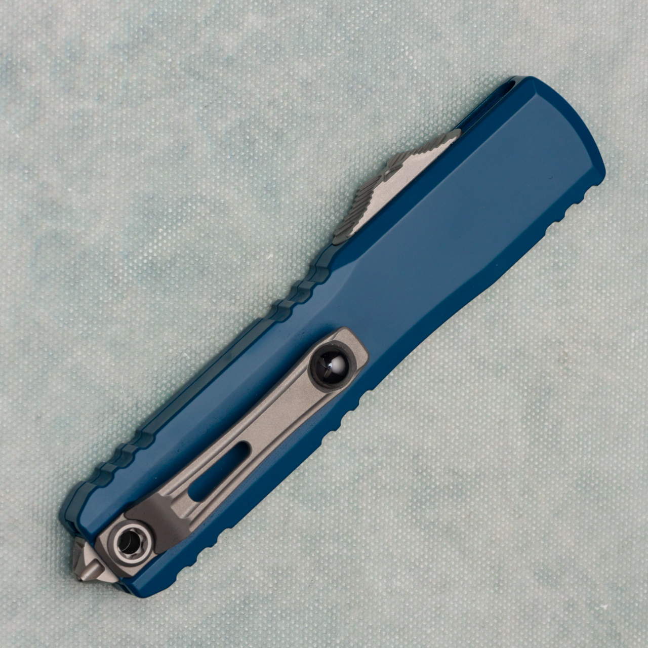 This brand new gen iv model runs on the new drive train and has the crud cutter. It has contoured deep ocean 6061-T6 aluminum handle scales with the Microtech Claw logo on the front. Stonewash finished M390MK stainless steel double edge blade with standard cutting edges. Bead blast finished hardware. New reversible pocket clip, lanyard hole, and glass breaker. The blade has the model information. These are not the zero blade play Ultratechs. Brand new in box.