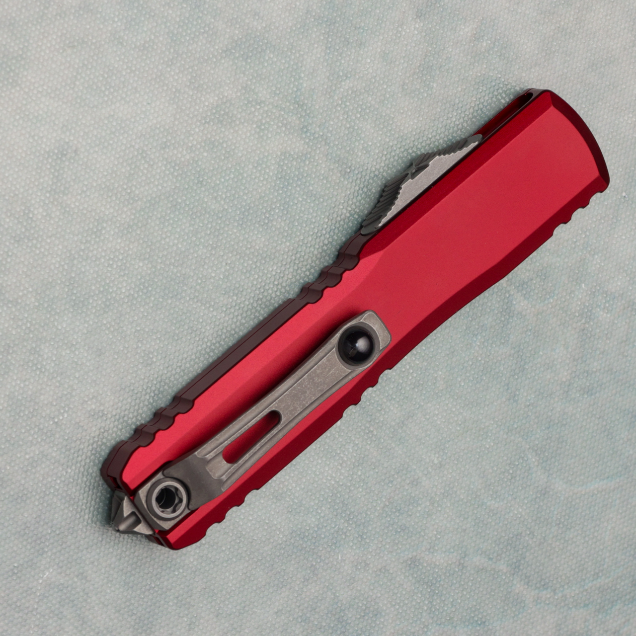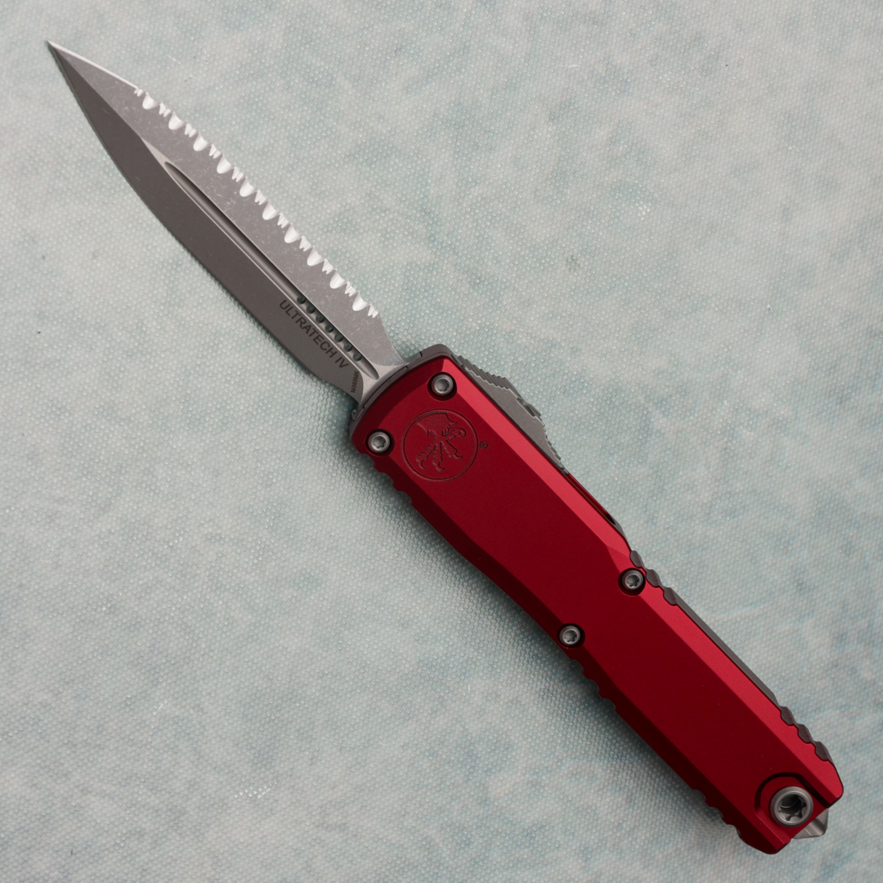 This brand new gen iv model runs on the new drive train and has the crud cutter. It has contoured merlot anodized 6061-T6 aluminum handle scales with the Microtech Claw logo on the front. Apocalyptic finished M390MK stainless steel double edge blade with a standard cutting edge and full serrated. Apocalyptic finished hardware. New reversible pocket clip, lanyard hole, and glass breaker. The blade has the model information. These are not the zero blade play Ultratechs. Brand new in box.