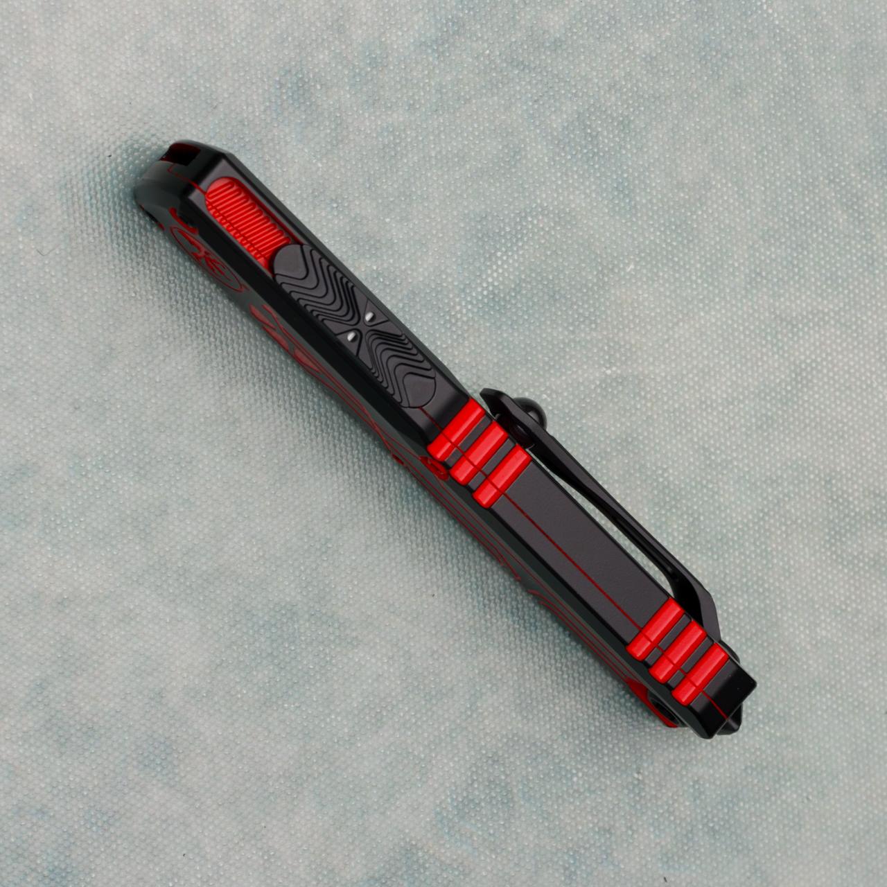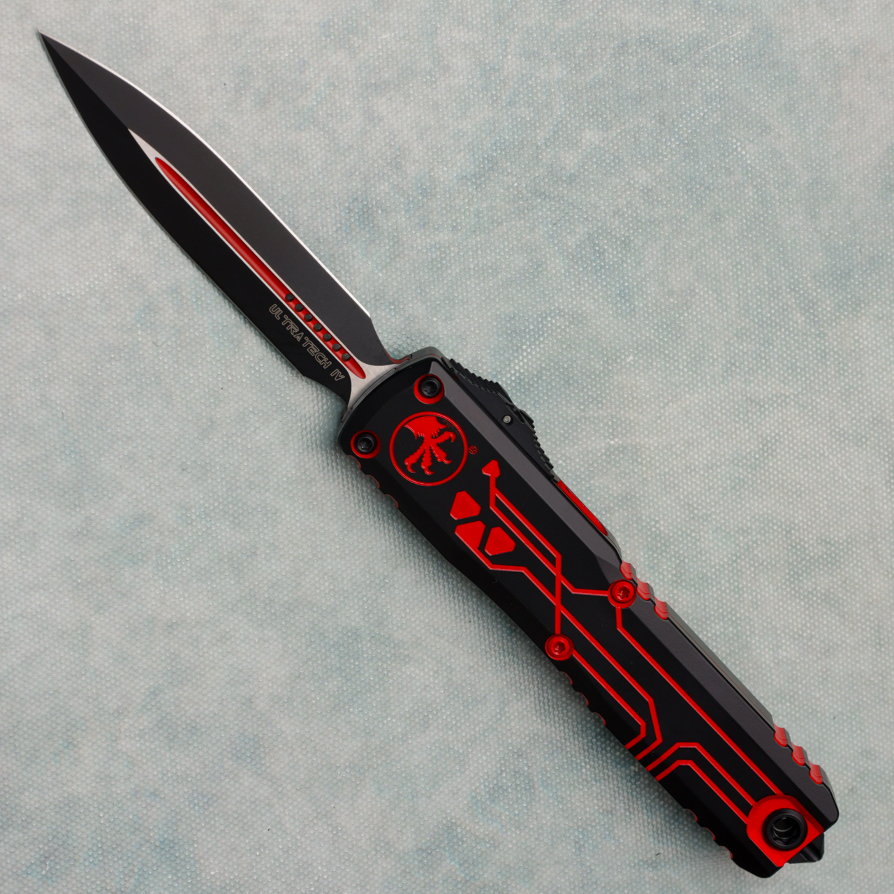 This brand new gen iv model runs on the new drive train and has the crud cutter. It has contoured black and red Tron cerakote 6061-T6 aluminum handle scales with the Microtech Claw logo on the front. Black and red cerakote finished M390MK stainless steel double edge blade with standard cutting edges. Black finished hardware. New reversible pocket clip, lanyard hole, and glass breaker. The blade has the model information. These are not the zero blade play Ultratechs. Brand new in box.