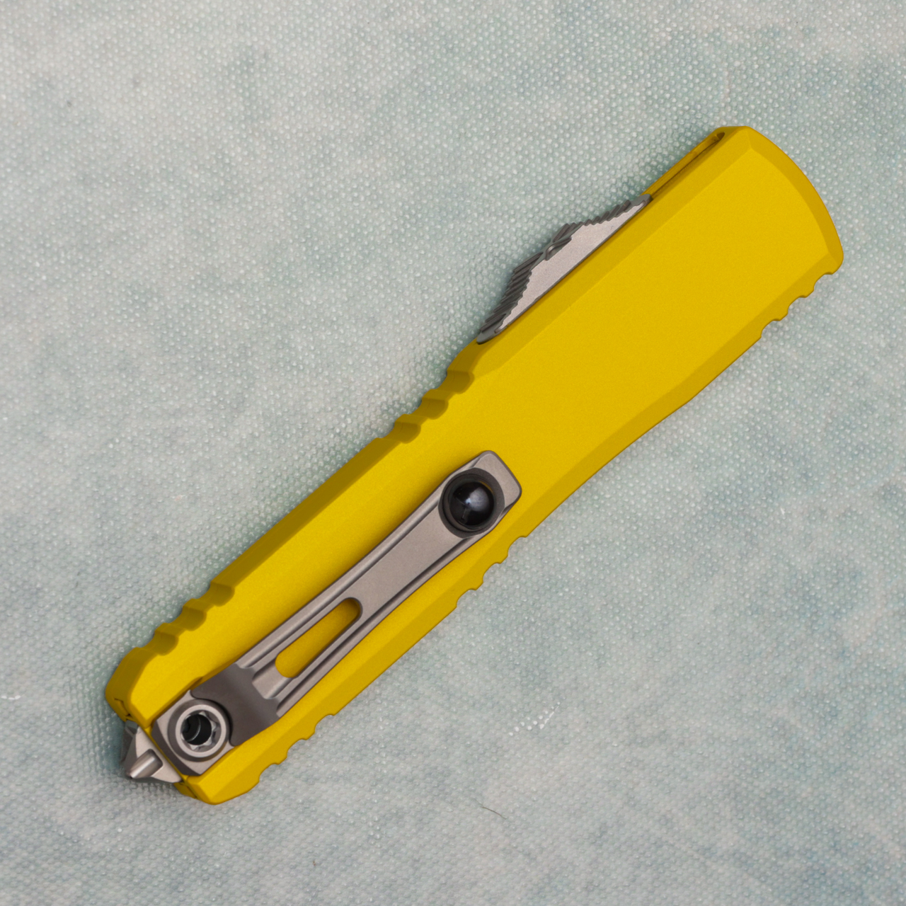 This brand new gen iv model runs on the new drive train and has the crud cutter. It has contoured yellow 6061-T6 aluminum handle scales with the Microtech Claw logo on the front. Stonewash finished M390MK stainless steel double edge blade with a standard cutting edge and full serrated. Bead blast finished hardware. New reversible pocket clip, lanyard hole, and glass breaker. The blade has the model information. These are not the zero blade play Ultratechs. Brand new in box.