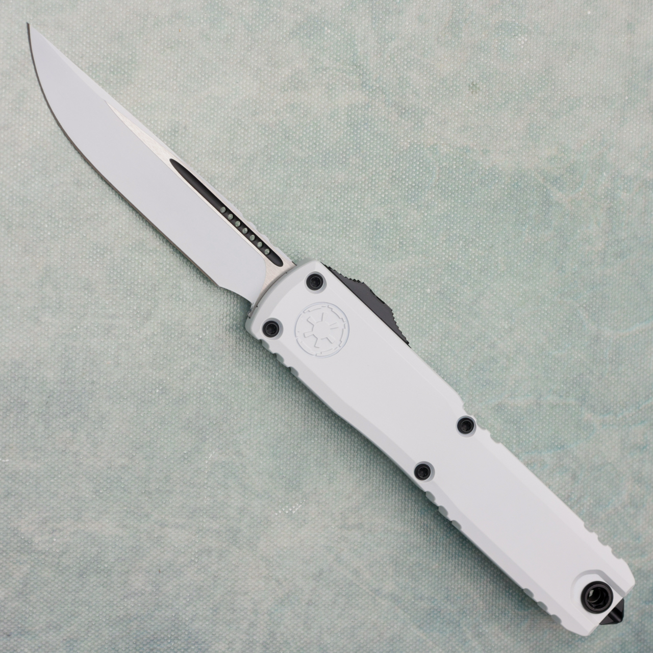 This brand new gen iv model runs on the new drive train and has the crud cutter. It has contoured stormtrooper themed 6061-T6 white cerakote aluminum handle scales with the Stormtrooper logo on the front. Cerakote finished M390MK stainless steel single edge blade with standard cutting edge. Black finished hardware. New reversible pocket clip, lanyard hole, and glass breaker. These are not the zero blade play Ultratechs. Brand new in box.