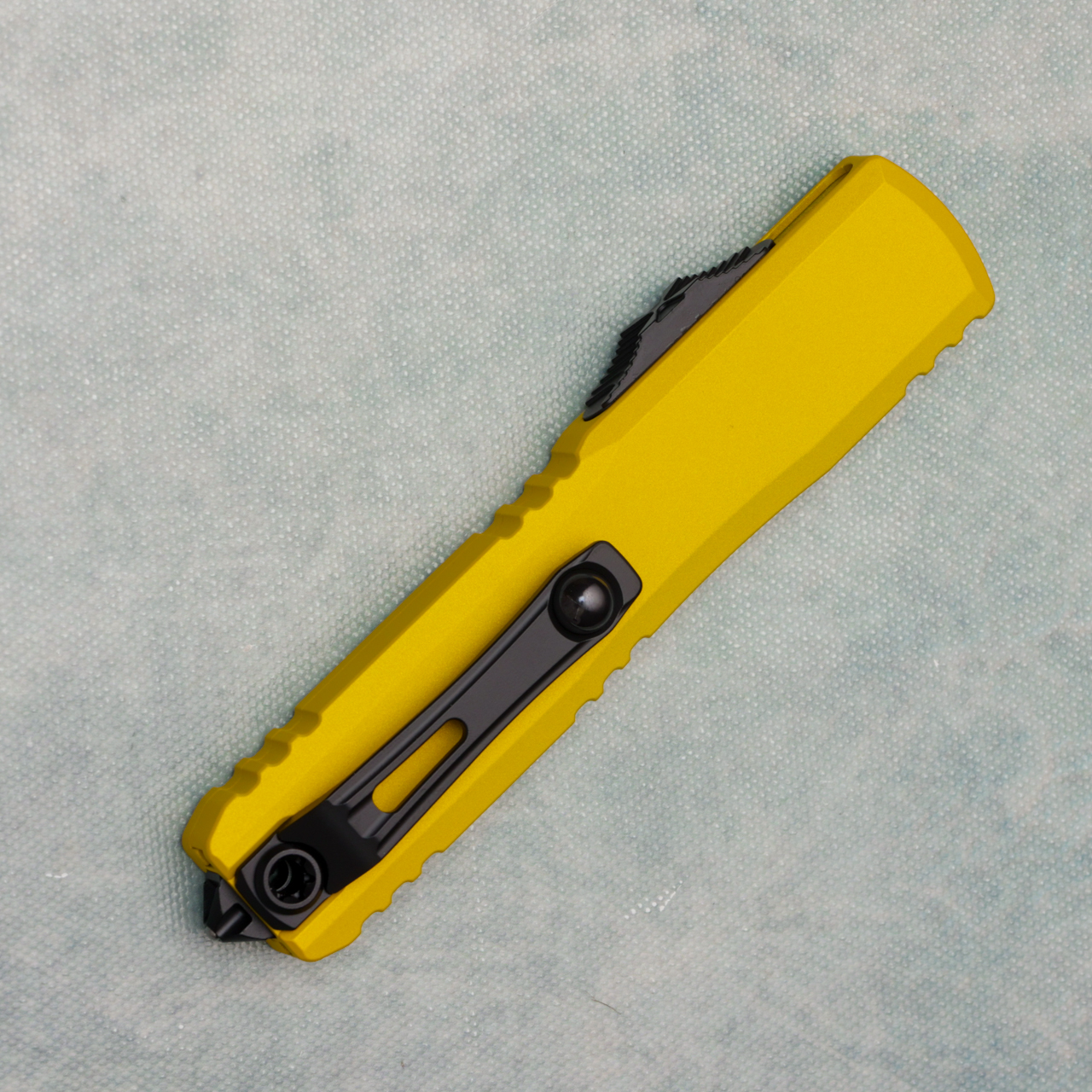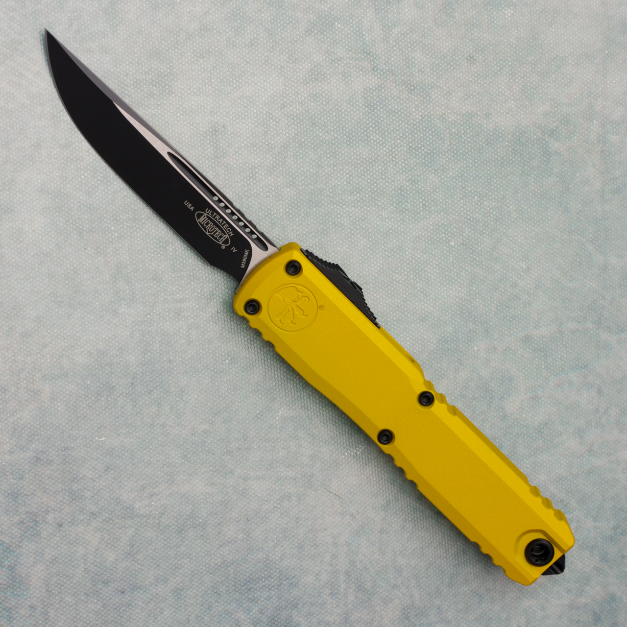 This brand new gen iv model runs on the new drive train and has the crud cutter. It has contoured yellow 6061-T6 aluminum handle scales with the Microtech Claw logo on the front. Black finished M390MK stainless steel single edge blade with standard cutting edge. Black finished hardware. New reversible pocket clip, lanyard hole, and glass breaker. The blade has the model information. These are not the zero blade play Ultratechs. Brand new in box.