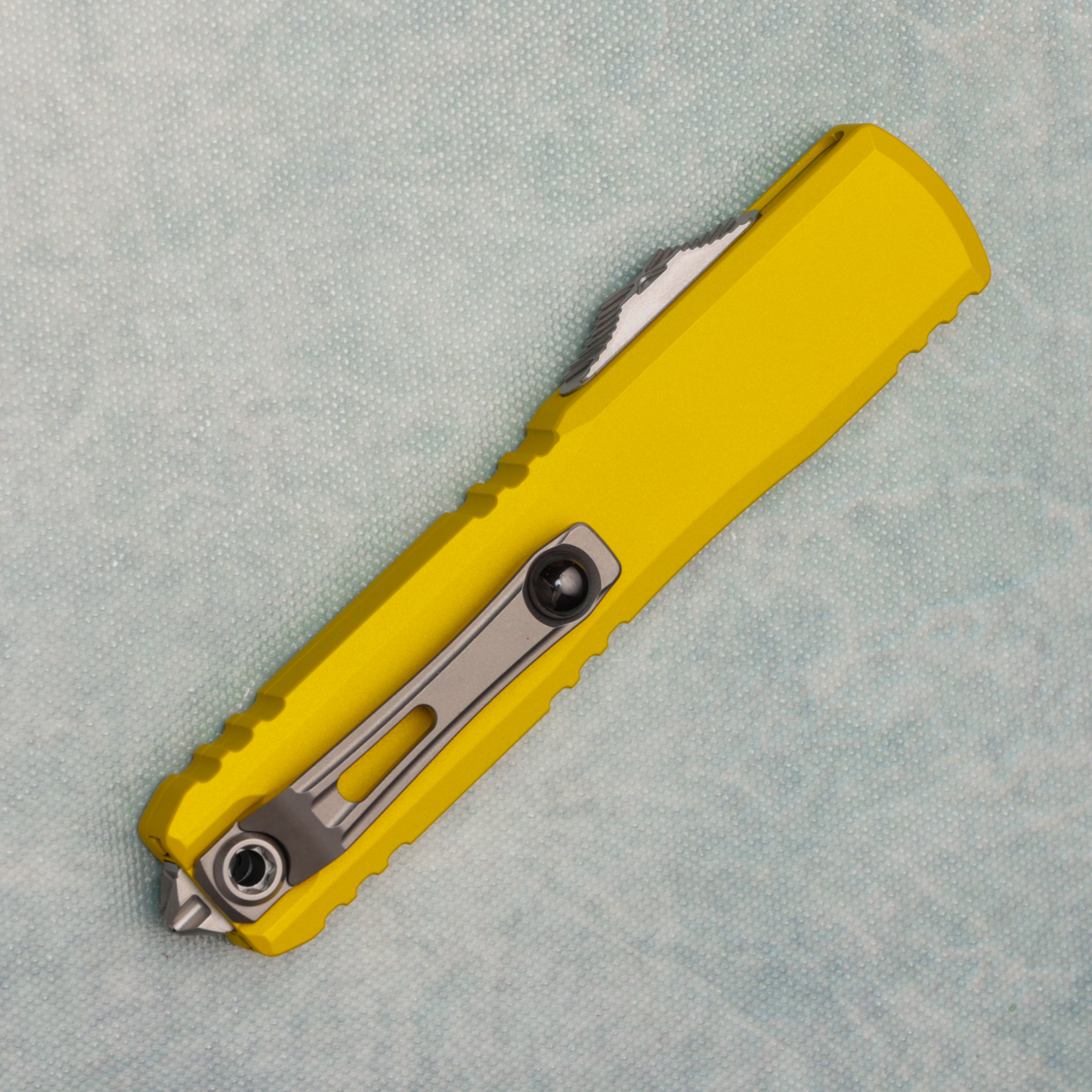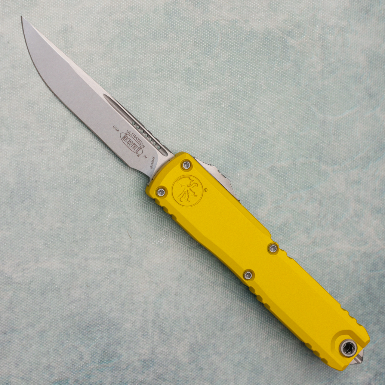 This brand new gen iv model runs on the new drive train and has the crud cutter. It has contoured yellow 6061-T6 aluminum handle scales with the Microtech Claw logo on the front. Stonewash finished M390MK stainless steel single edge blade with standard cutting edge. Bead blast finished hardware. New reversible pocket clip, lanyard hole, and glass breaker. The blade has the model information. These are not the zero blade play Ultratechs. Brand new in box.