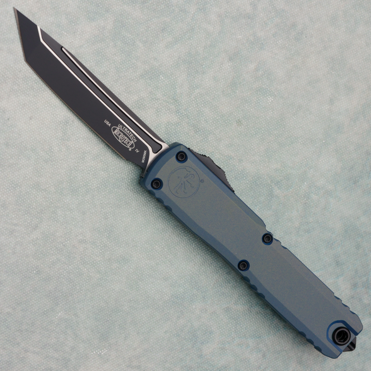 This brand new gen iv model runs on the new drive train and has the crud cutter. It has contoured Caspian blue finished 6061-T6 aluminum handle scales with the Microtech Claw logo on the front. Two tone black and satin finished M390MK stainless steel tanto edge blade with standard cutting edge. Black finished hardware. New reversible pocket clip, lanyard hole, and glass breaker. The blade has the model information. These are not the zero blade play Ultratechs. Brand new in box.