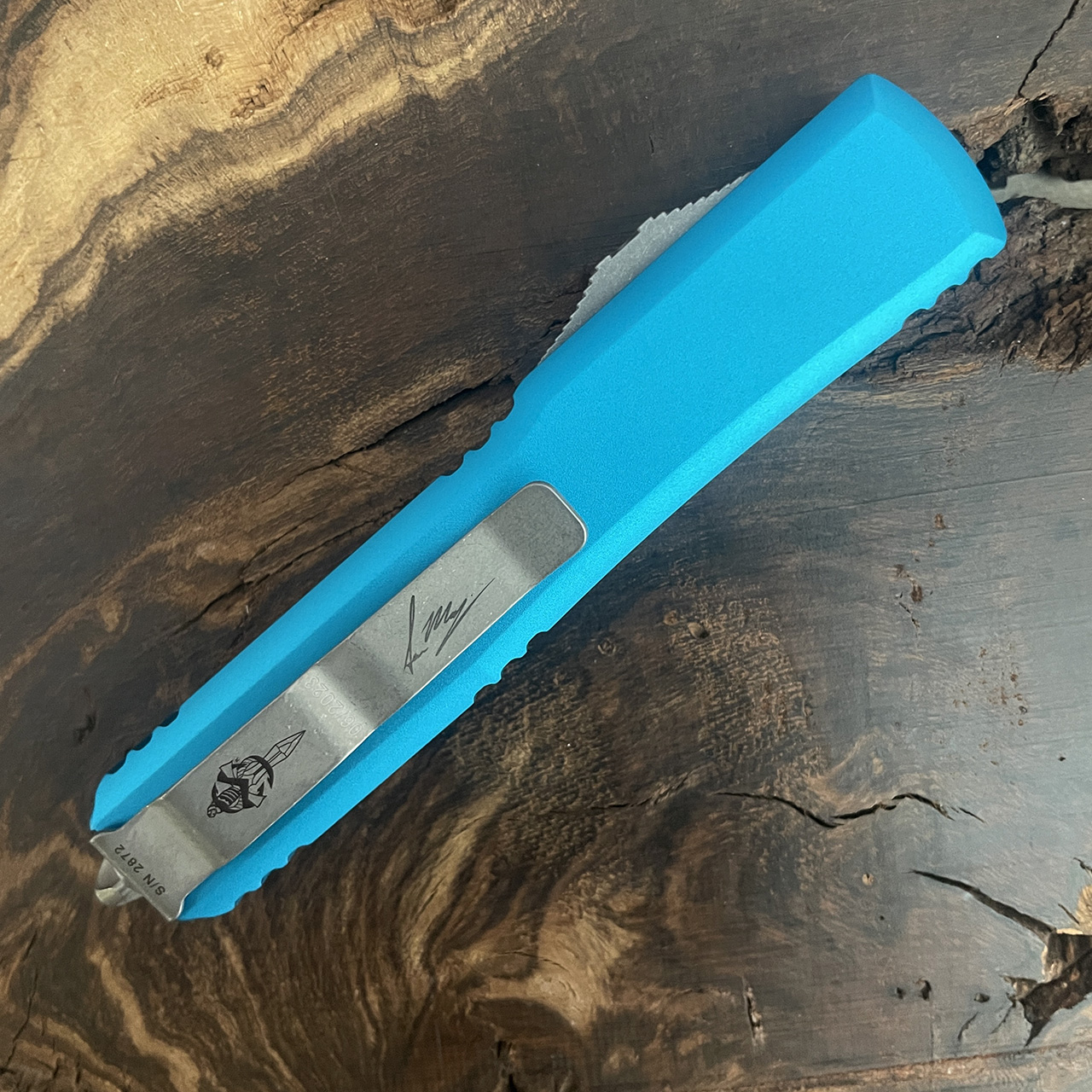 This limited edition signature series model has turquoise anodized 6061-T6 contoured aluminum handle scales, the front has the Sean Marfione dagger logo. Apoclayptic finished M390 stainless steel hellhound tanto blade. Apocalyptic finished hardware, reversible pocket clip, lanyard hole, and glass breaker. The clip features the Microtech Claw logo, Sean Marfione signature series logo, and production date. This is a wicked cool blade, a must have! Brand new in box.