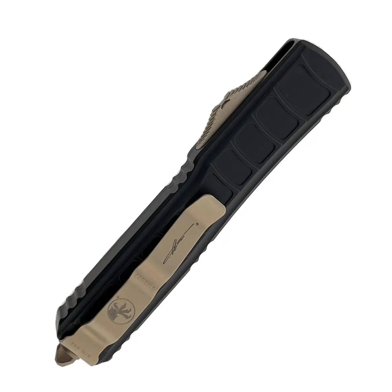 Bronzed finished hardware, reversible pocket clip, lanyard hole, and glass breaker. The blade has the model information. The clip features the Microtech logo, Signature Series logo, serial number and production date. Brand new in box.
