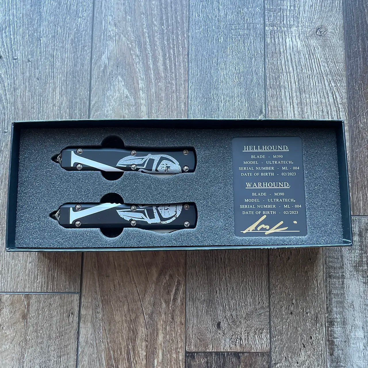 This signature series set features two matching knives with blakc anodized 6061-T6 contoured aluminum handle scales. Bronzed Apocalyptic finished M390 stainless steel warhound and hellhound blades. Each blade handle features the opposite side of the Molon Labe Spartan helmet. Bronzed apocalyptic finished hardware, pocket clip, and glass breaker. This set features the Signature Series logo and dagger on the pocket clip as well as the production date and serial number. This is a matching serial number set. Brand new in box with COA plate.