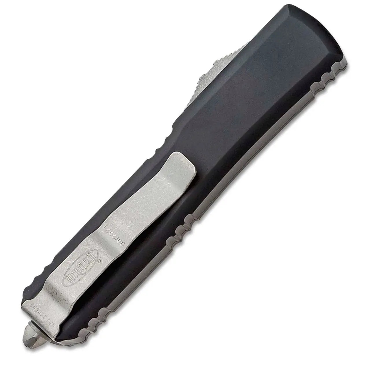 This model features black anodized 6061-T6 aluminum handle scales with the Microtech Claw Logo on the front. Apocalyptic finished M390 stainless steel single edge drop point blade with partially serrated cutting edge. Apocalyptic finished hardware. Reversible pocket clip, lanyard hole, and glass breaker. The blade is marked with the Microtech logo and model information. The pocket clip is marked with the Microtech logo, serial number, and production date. Brand new in box.