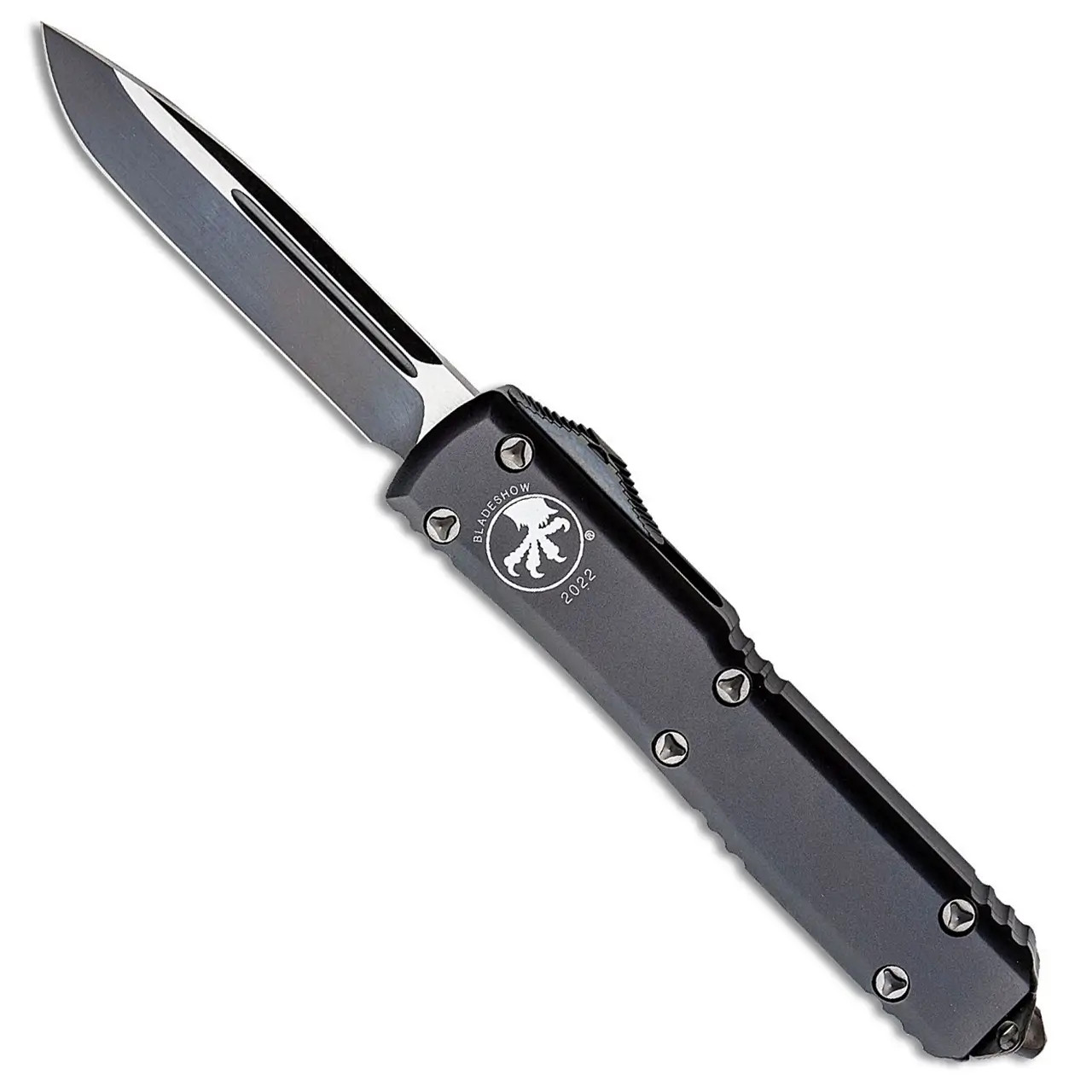 This model features black anodized 6061-T6 contoured aluminum handle scales with the Microtech Claw Logo, and "Blade Show 2022" on the front. Two tone black/satin finished M390 stainless steel single edge drop point blade. DLC finished hardware, reversible pocket clip, lanyard hole, and glass breaker. The pocket clip is marked with the Microtech logo. Brand new in box.