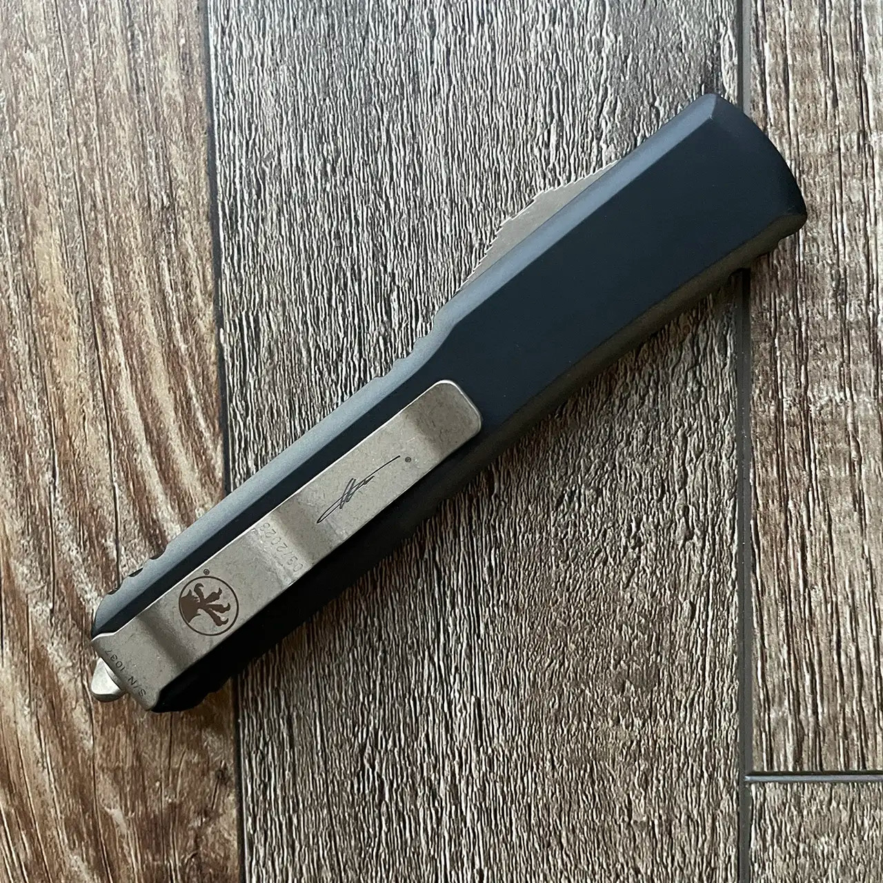 This limited edition Signature Series model features black anodized 6061-T6 contoured aluminum handle scales with the left side of Death Card graphic and the Microtech Claw logo. Bronzed apocalyptic finished M390 stainless steel single edge drop point blade. The blade is etched "MEMENTO MORI". Bronzed apocalyptic finished hardware, pocket clip, and glass breaker. The pocket clip is marked with the Claw logo, Signature Series logo, serial number, and production date. Brand new in box.