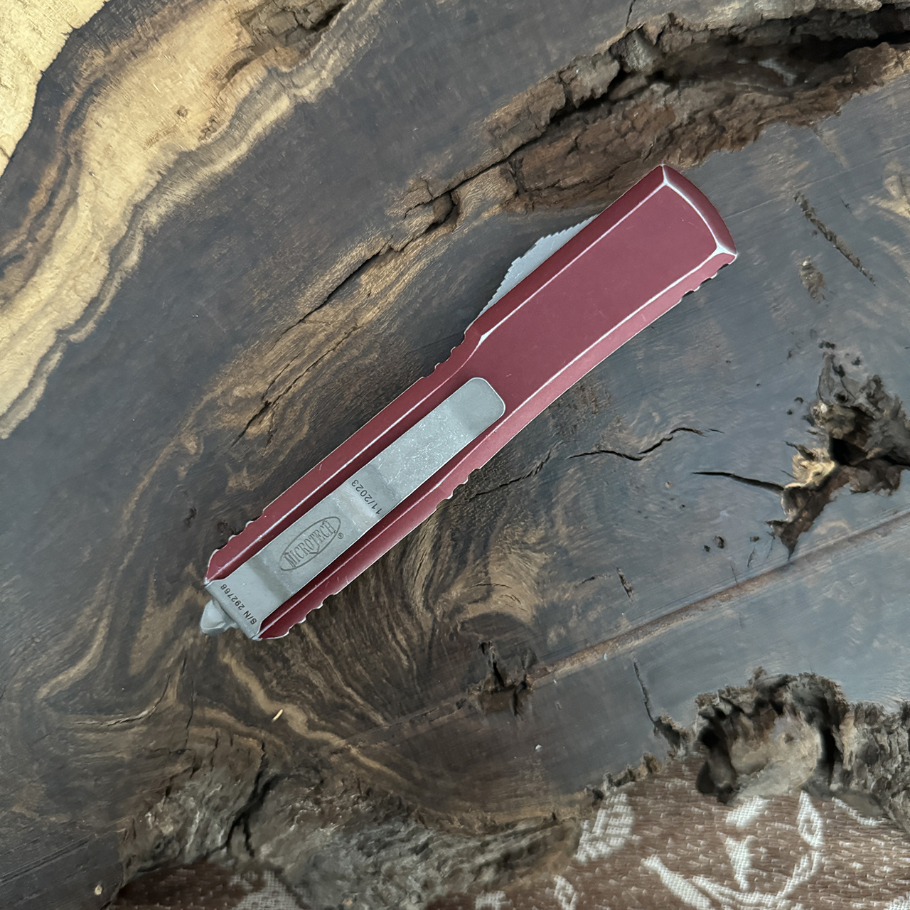 This model features distressed merlot anodized 6061-T6 aluminum handle scales with the Microtech Claw Logo on the front. Apocalyptic finished M390 stainless steel single edge drop point blade with partially serrated cutting edge. Apoclayptic finished hardware. Reversible pocket clip, lanyard hole, and glass breaker. The blade is marked with the Microtech logo and model information. The pocket clip is marked with the Microtech logo, serial number, and production date. Brand new in box.