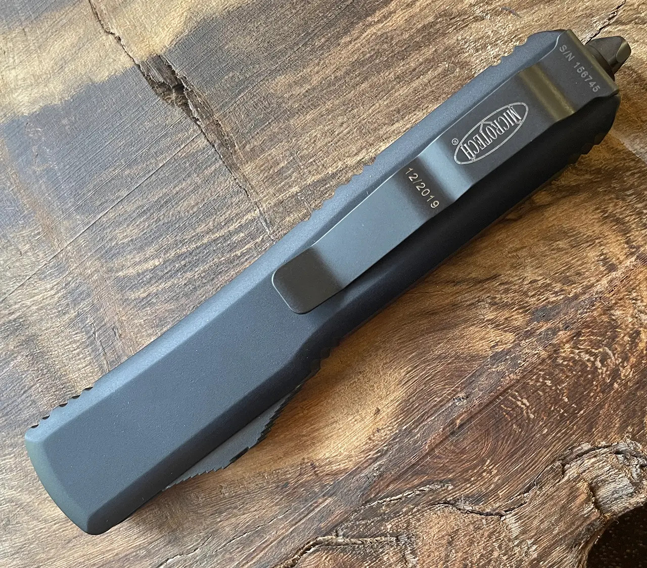 This model features black anodized 6061-T6 aluminum handle scales with the Microtech Claw Logo on the front. DLC finished Elmax stainless steel single edge drop point blade. All black finished hardware. Reversible pocket clip, lanyard hole, and glass breaker. The blade is marked with the Microtech logo and model information. The pocket clip is marked with the Microtech logo, serial number, and production date.