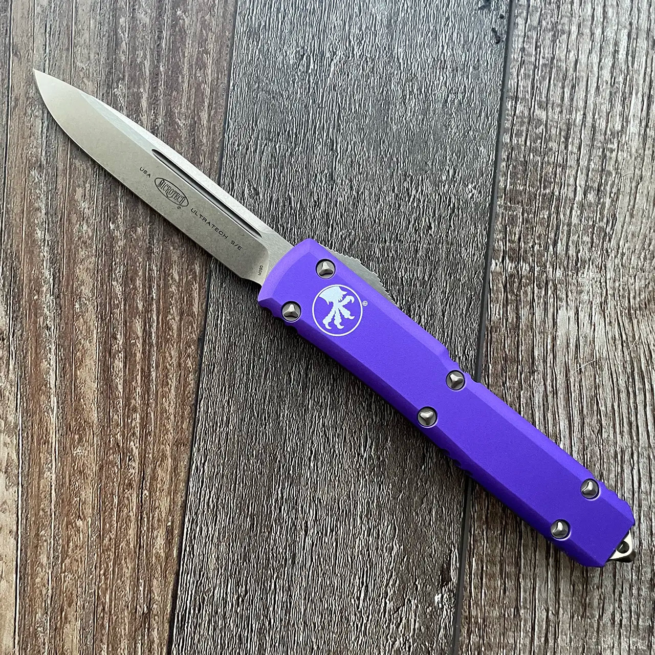 This model features purple anodized 6061-T6 contoured aluminum handle scales. Bronzed finished M390 stainless steel single edge drop point blade. Bronzed finished hardware, pocket clip, and glass breaker. The pocket clip is marked with the Microtech logo, serial number, and production date. The blade is marked with Microtech logo and model information. Brand new in box.