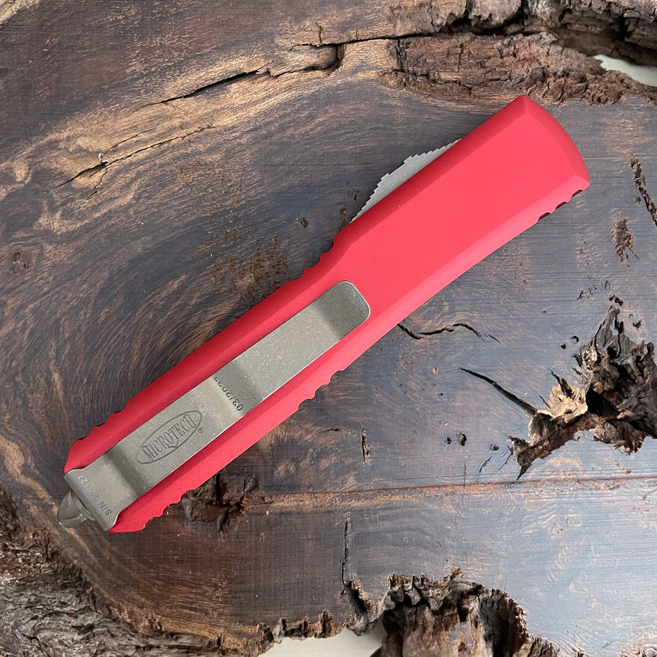 This model features red anodized 6061-T6 contoured aluminum handle scales. Bronzed apocalyptic finished M390 stainless steel single edge drop point blade. Bronzed apocalyptic finished hardware, pocket clip, and glass breaker. The pocket clip is marked with the Microtech logo, serial number, and production date. The blade is marked with Microtech logo and model information. Brand new in box.