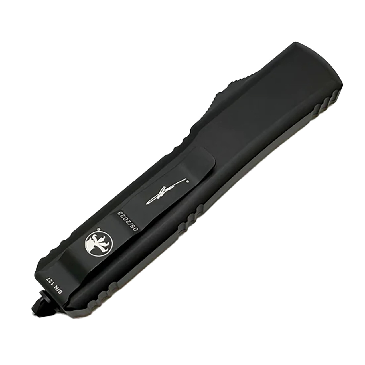 This Signature Series model has Tan Frag G-10 Top and black finished aluminum back handle scales. Black finished M390 stainless steel single edge blade with standard cutting edge. Black finished hardware, lanyard hole, glass breaker, and pocket clip. The clip features the Microtech claw logo,Signature Series logo, serial number, and production date. Brand new in box.